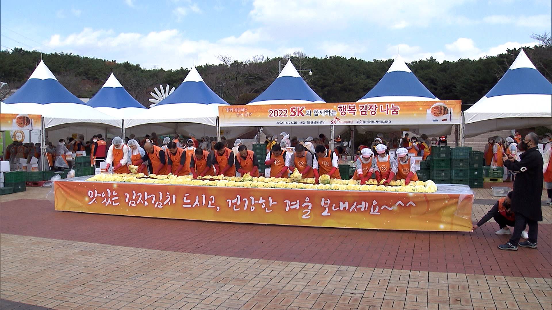 SK이노베이션 울산 콤플렉스는 오늘(11/28)울산대공원 남문광장에서 '2022 SK 행복김장 나눔 행사'를 열었습니다. 올해로 19년째를 맞는 SK 행복김장 나눔 행사에는 자원봉사자 등 300여명이 참가해 10kg들이 2천100박스 분량의 김장김치를 담가 저소득가정과 사회복지시설 48개소에 전달했습니다.
