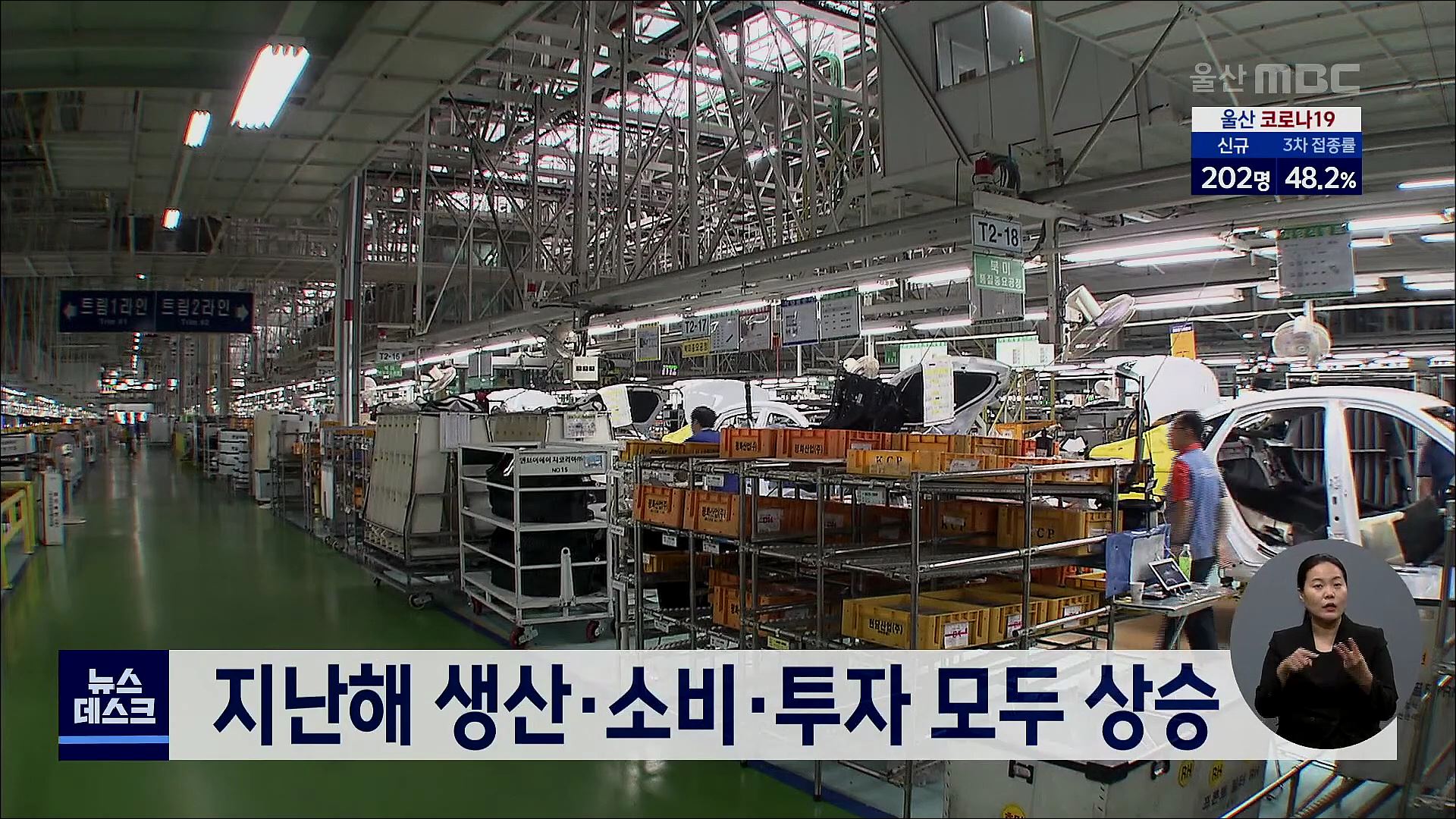 지난해 울산은 생산과 소비가 상승으로 반전했고 투자는 소폭 증가해 3박자가 모두 좋았던 것으로 집계됐습니다. 동남지방통계청이 밝힌 2021년 연간 울산시 산업 활동 동향에 따르면 울산은 지난해 자동차, 화학제품의 선전으로 재작년에 비해 생산이 2% 늘었습니다. 소비는 백화점 매출이 늘면서 2.2% 상승했고 투자는 건...