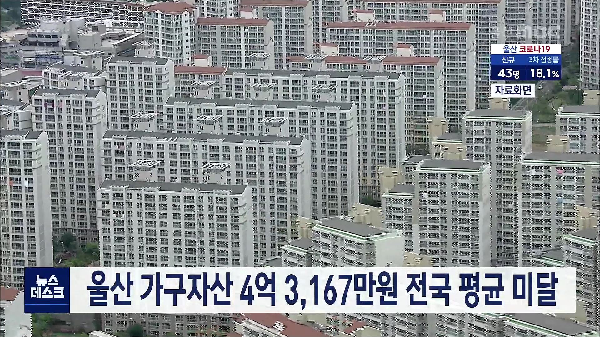 울산지역 부동산 가격 급등으로 지역 가구의 평균 자산 보유액이 올 3월말 기준 4억원을 넘어섰지만 전국 평균에 미치지 못하는 것으로 나타났습니다. 통계청이 발표한 가계금융복지 조사 결과에 따르면 올해 3월말 기준 울산지역 가구의 평균 자산은 4억 3,167만원, 부채는 6,963만원으로, 1년 전에 비해 각각 9.5%와 2.7%...