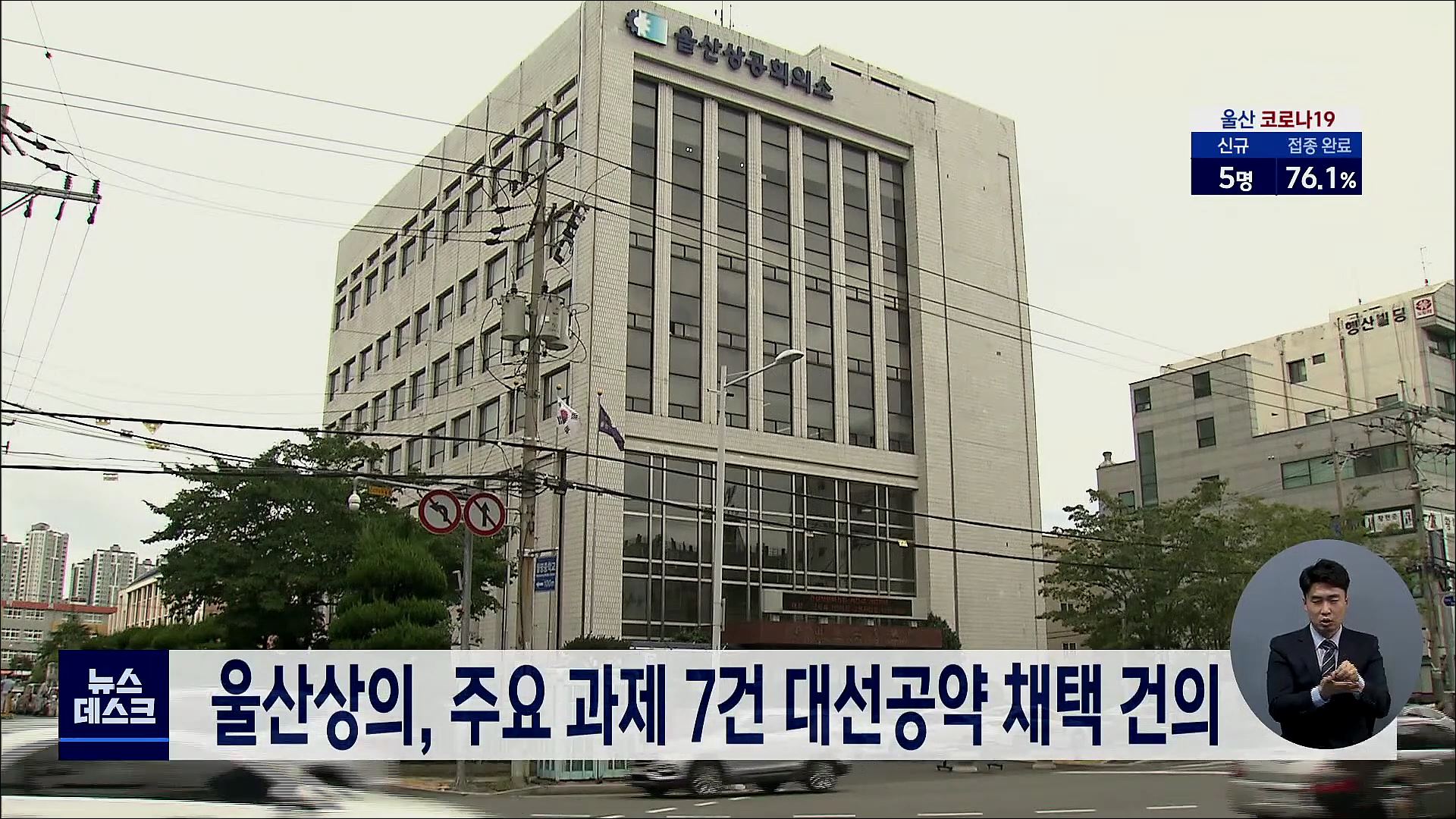 울산상공회의소는 오늘(11/18) 지역 발전을 위한 '주요 과제 7건'을 선정해 더불어민주당과 국민의힘 등 지역 정당에 전달했습니다. 울산상의는 국가 게놈 기술원 설립과 개발제한구역의 전면 재검토, 울산공항 활성화, 동북아오일허브 특별법 제정 등을 건의했습니다.