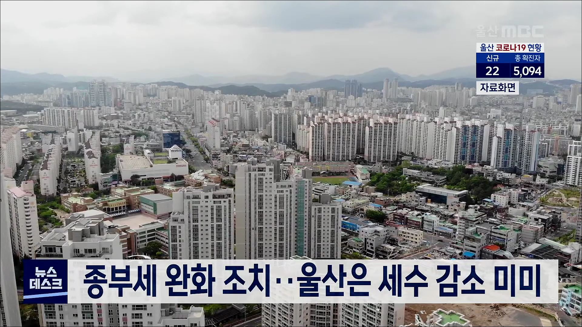 정부가 1세대, 1주택자에 대한 종합부동산세를 완화했지만 울산지역에서는 세수 감소 효과가 크지 않을 것으로 보입니다. 국회 기획재정위원회 추경호 의원이 국회 예산정책처로부터 받은 자료에 따르면 울산에서는 종부세 완화로 올해 관련 세액이 2천만 원 가량 줄어들 것으로 조사됐습니다. 울산은 종합부동산세 부과 대...