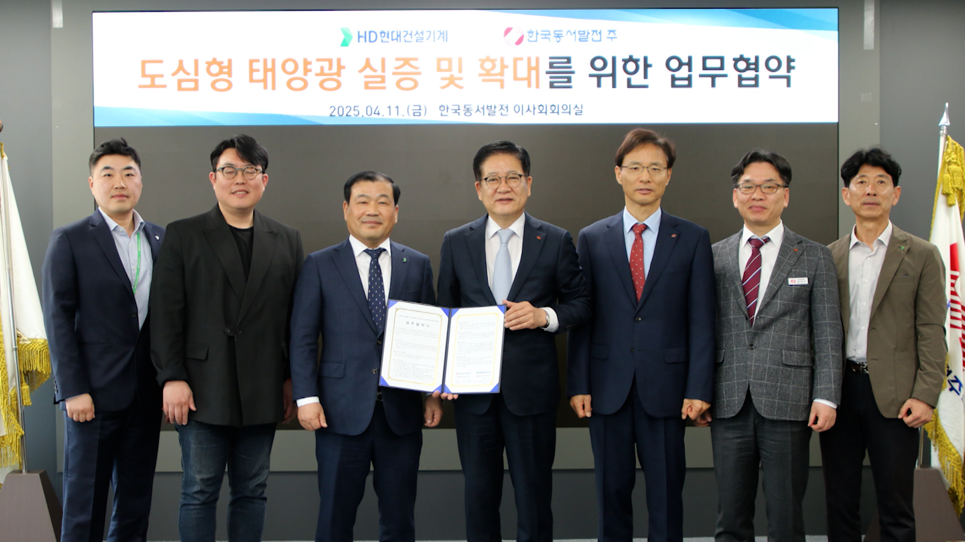 한국동서발전과 HD현대건설기계가 건물 외장형 태양광 실증을 위한 업무협약을 체결했습니다. 동서발전은 다음달중에 HD현대건설기계 울산공장에 태양광 조형물을 설치해 실증을 거친 뒤 울산 전역에 확대 적용할 에정입니다. 건물 외장형 태양광은 건물 외벽이나 창문처럼 건축자재로 쓰이는 태양광으로 한국동서발전과 울...