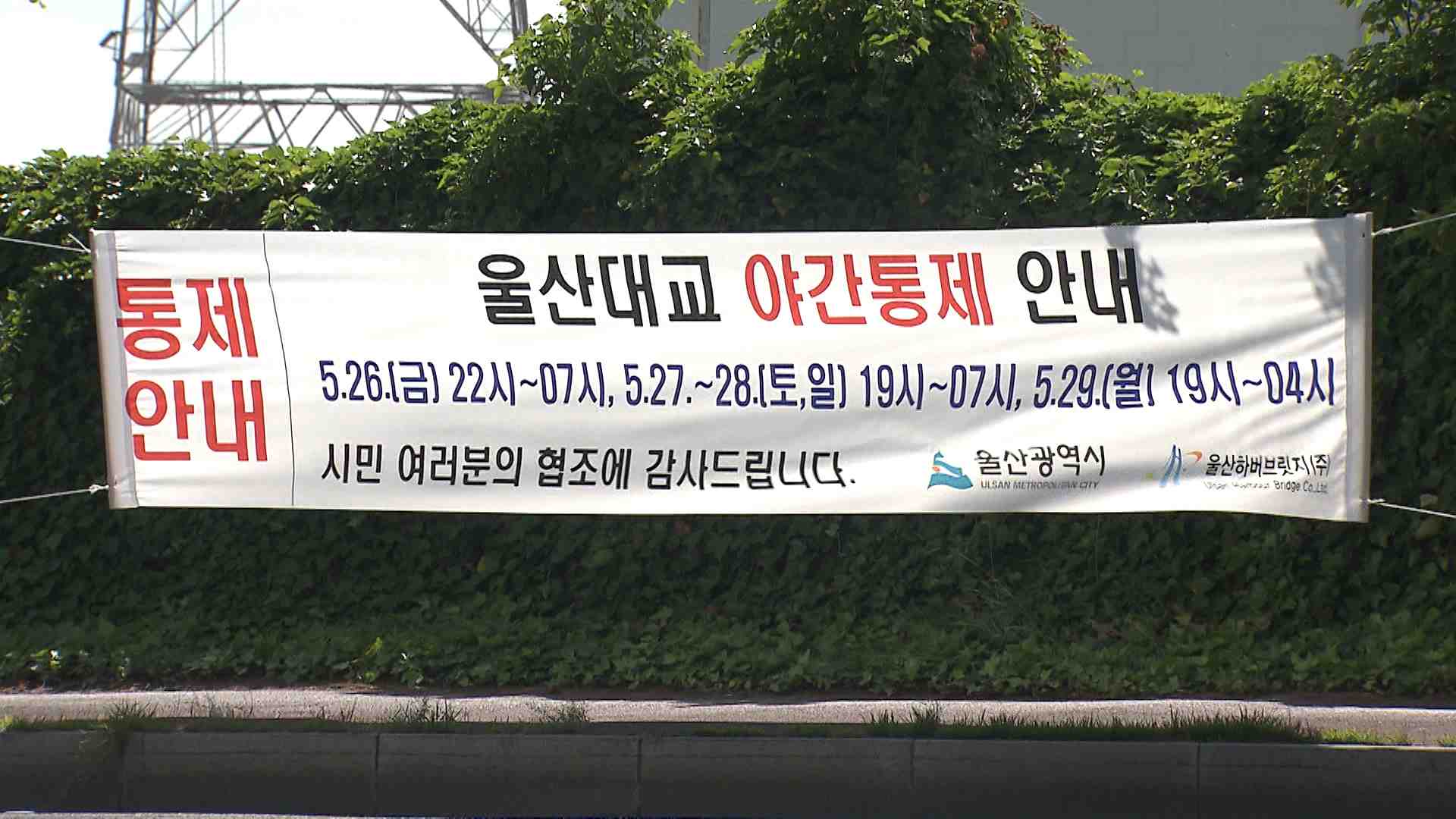 울산대교 양방향이 드라마 촬영으로 오는 26일부터 29일까지 야간 시간대 통제됩니다. 오는 26일에는 오후 10시부터 다음 날 오전 6시까지, 주말과 휴일인 27일과 28일에는 오후 7시부터 다음 날 오전 6시까지, 29일에는 오후 7시부터 다음 날 오전 4시까지 이용할 수 없습니다. 울산시는 시민 불편을 줄이기 위해 통행량이...