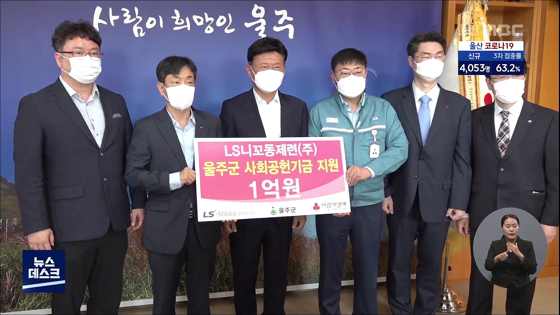 LS-Nikko동제련이 오늘(4/12) 오전 울산사회복지공동모금회를 통해 울주군에 지정기탁성금 1억 원을 전달했습니다. LS-Nikko동제련 지난 2018년부터 5년째 매년 1억 원 이상씩 성금을 전달하고 있습니다. 대한유화도 코로나19 취약계층 지원을 위한 성금 4천만 원을 울주군에 전달했습니다.