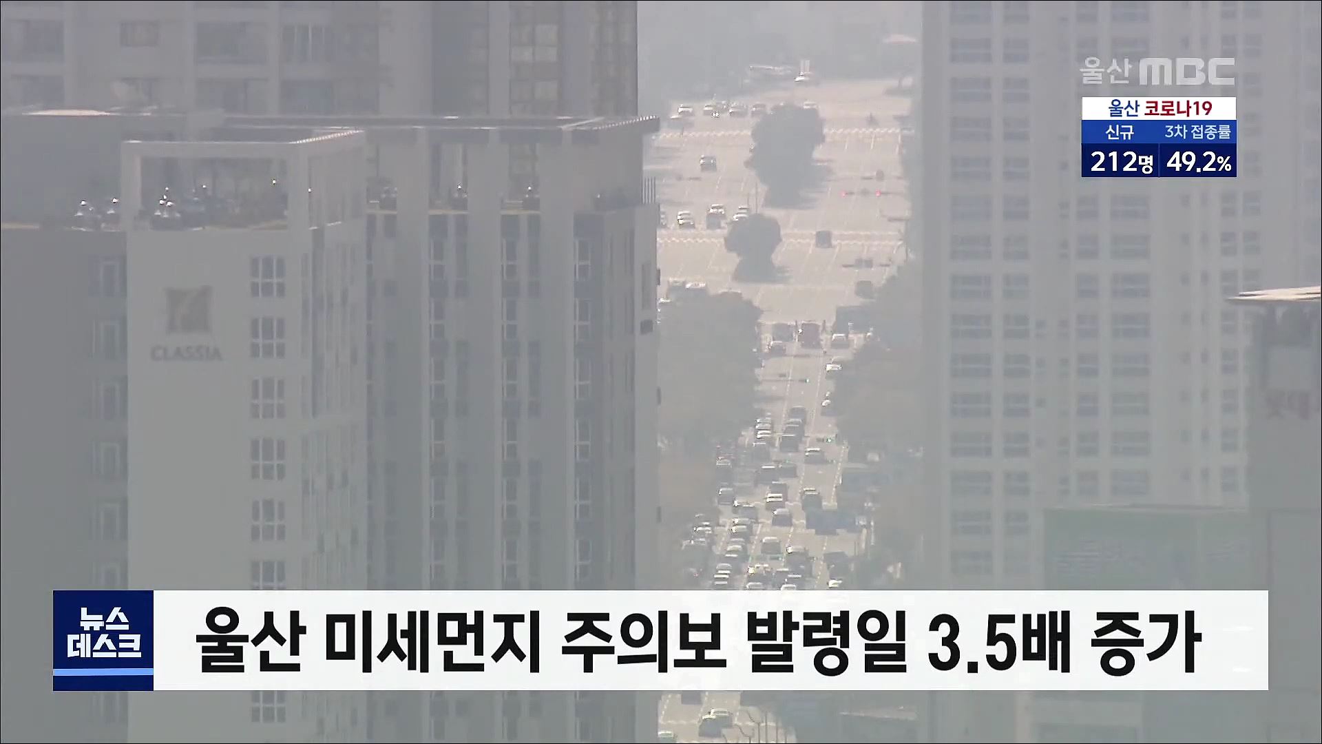 지난해 울산지역 미세먼지 주의보 발령일이 전년 대비 3배 이상 증가한 것으로 나타났습니다. 울산시 보건환경연구원은 지난해 미세먼지 주의보와 경보 발령일은 7일로 전년보다 3.5배 증가했다고 밝혔습니다. 이는 몽골 고비사막 등에서 발원한 황사와 대기 정체로 국내 미세먼지가 축적된 영향으로 분석됩니다.//