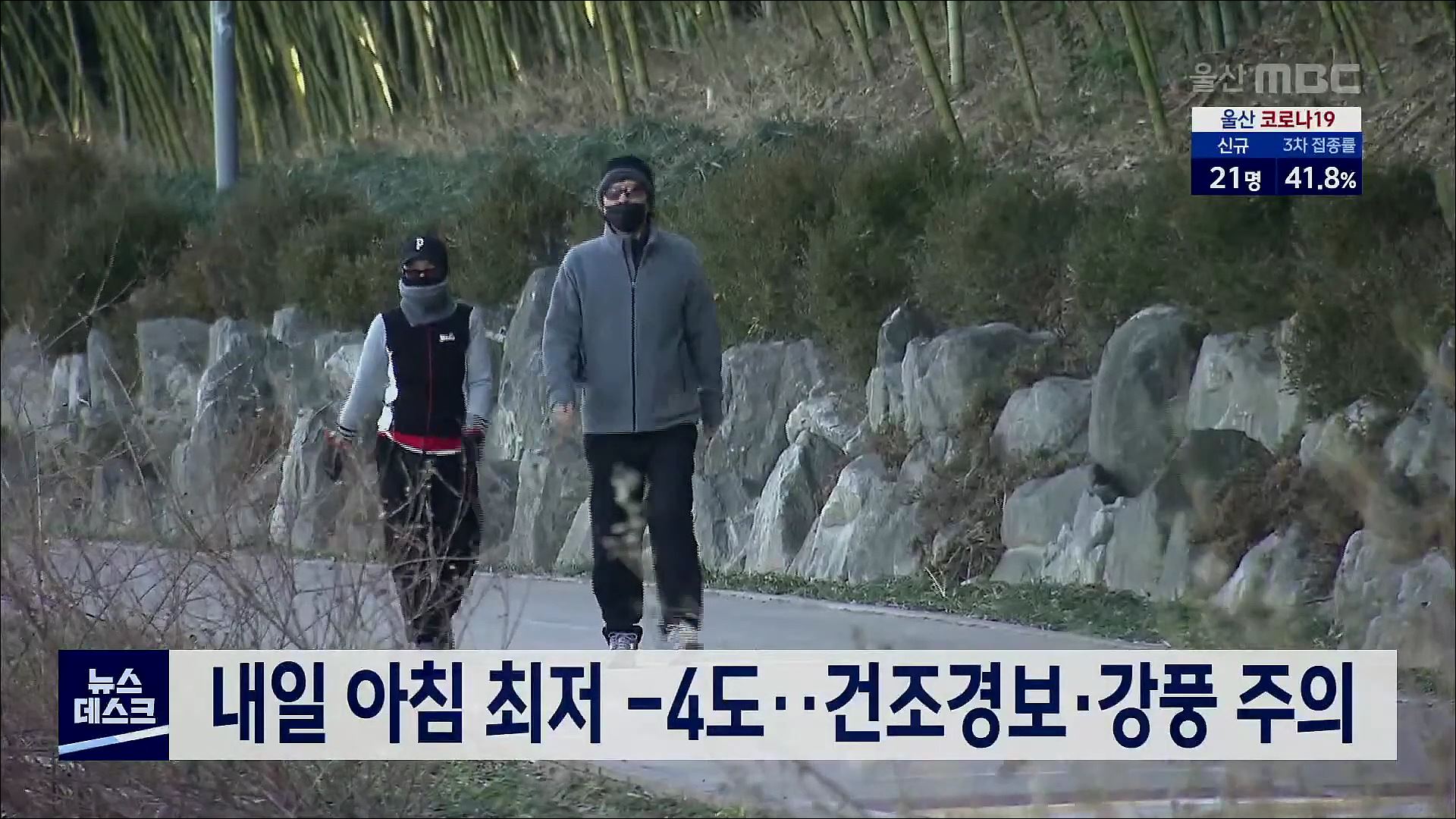 오늘(1/17) 울산지방은 맑은 날씨 속에 낮 최고 기온이 어제보다 6도 낮은 4.8도를 기록했습니다. 내일은 아침 최저 기온이 영하 6도까지 떨어져 춥겠고, 낮 최고 기온도 4도에 머물겠습니다. 울산기상대는 나흘째 건조경보가 내려진 가운데 내일 새벽까지 바람도 강하게 불겠다며 산불 등 화재예방에 주의를 당부했습니다.