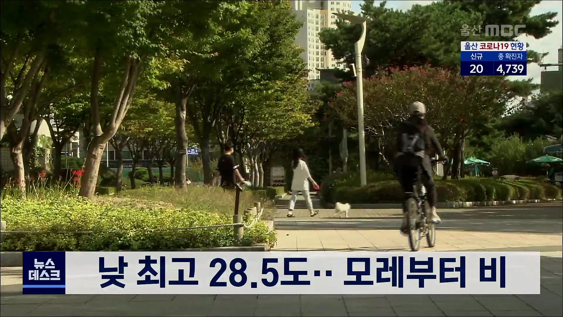 오늘(9/10) 울산지방은 대체로 흐린 가운데낮 최고 기온이 26.1도를 기록해 어제보다 1도 정도 낮았습니다.주말인 내일은 가끔 구름이 많겠고기온은 19도~29도의 분포가 예상됩니다.울산기상대는 주말 동안 덥고일교차 큰 날씨가 이어지겠다고 내다봤습니다.