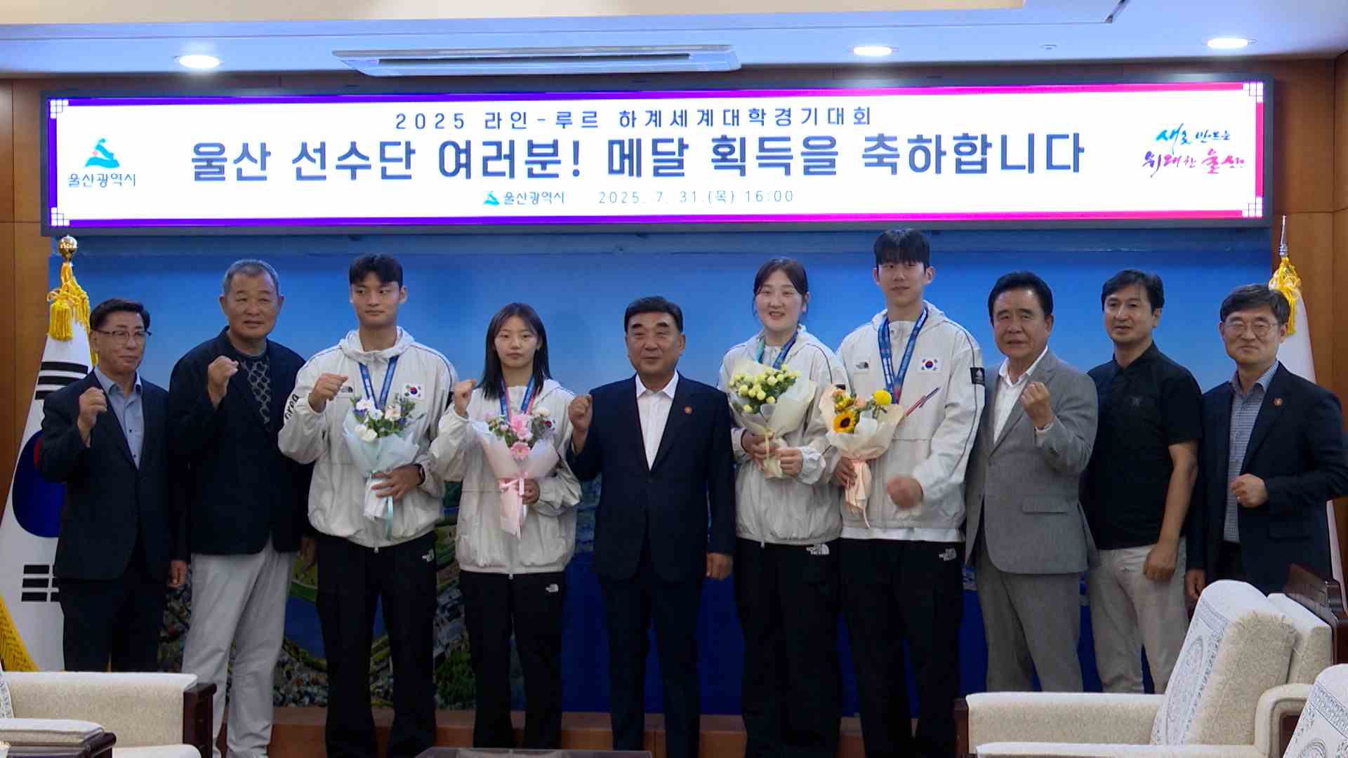2025 독일 라인루르 하계세계대학경기대회에서 전원 메달을 따내고 귀국한 울산 태권도선수단이 오늘(7/31) 울산시청을 방문해 축하 꽃다발을 받았습니다. 서건우, 강상현 선수는 개인전과 단체전 금메달을, 송다빈 선수는 개인전 금메달과 단체전 은메달을, 서여원 선수는 개인전 동메달에 단체전에서 은메달을 추가했습니...