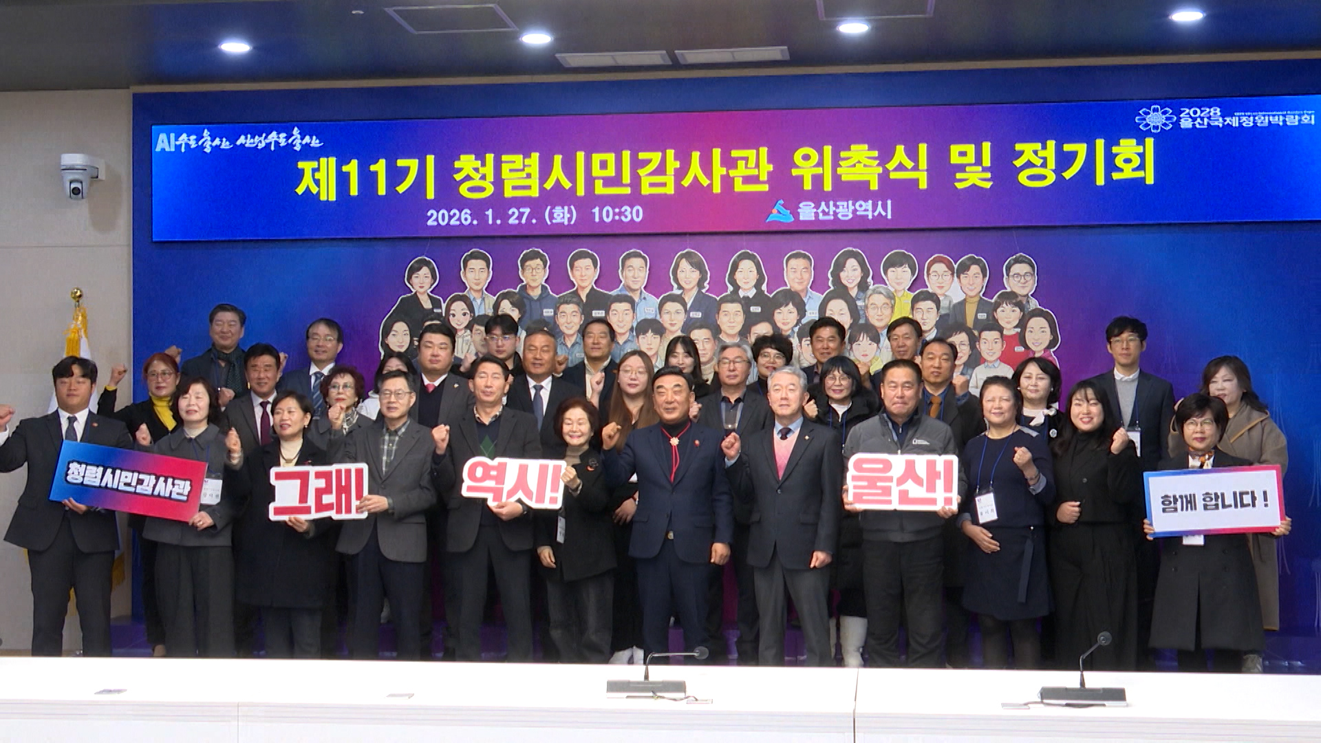 제11기 울산시 청렴시민감사관 위촉식이 오늘(1/27) 시청 2층 대회의실에서 열렸습니다.이들의 임기는 올해 1월 1일부터 내년 12월 31일까지 2년으로 구청장‧군수 추천자와 청년세대, 전문가 등으로 구성돼 있습니다.위촉된 시민감사관은 38명으로 생활 속 불편·불만사항과 공직자 부조리에 대한 제보와 시정 발전을 위한 ...