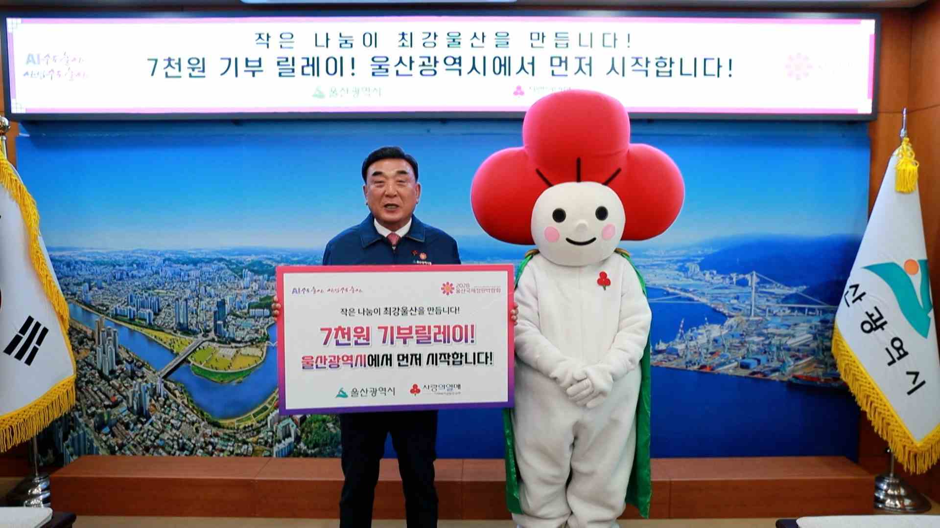 울산사회복지공동모금회가 진행하는 ‘7천 원 기부릴레이’에 울산시가 첫 주자로 나서며 시민들의 참여를 당부했습니다.'7천 원 기부릴레이’는 울산시민 110만 명이 1인당 7천 원씩 기부하면, 올해 사랑의 온도탑 목표액인 72억 5천만 원을 채울 수 있다는 취지로 새롭게 마련된 캠페인입니다.