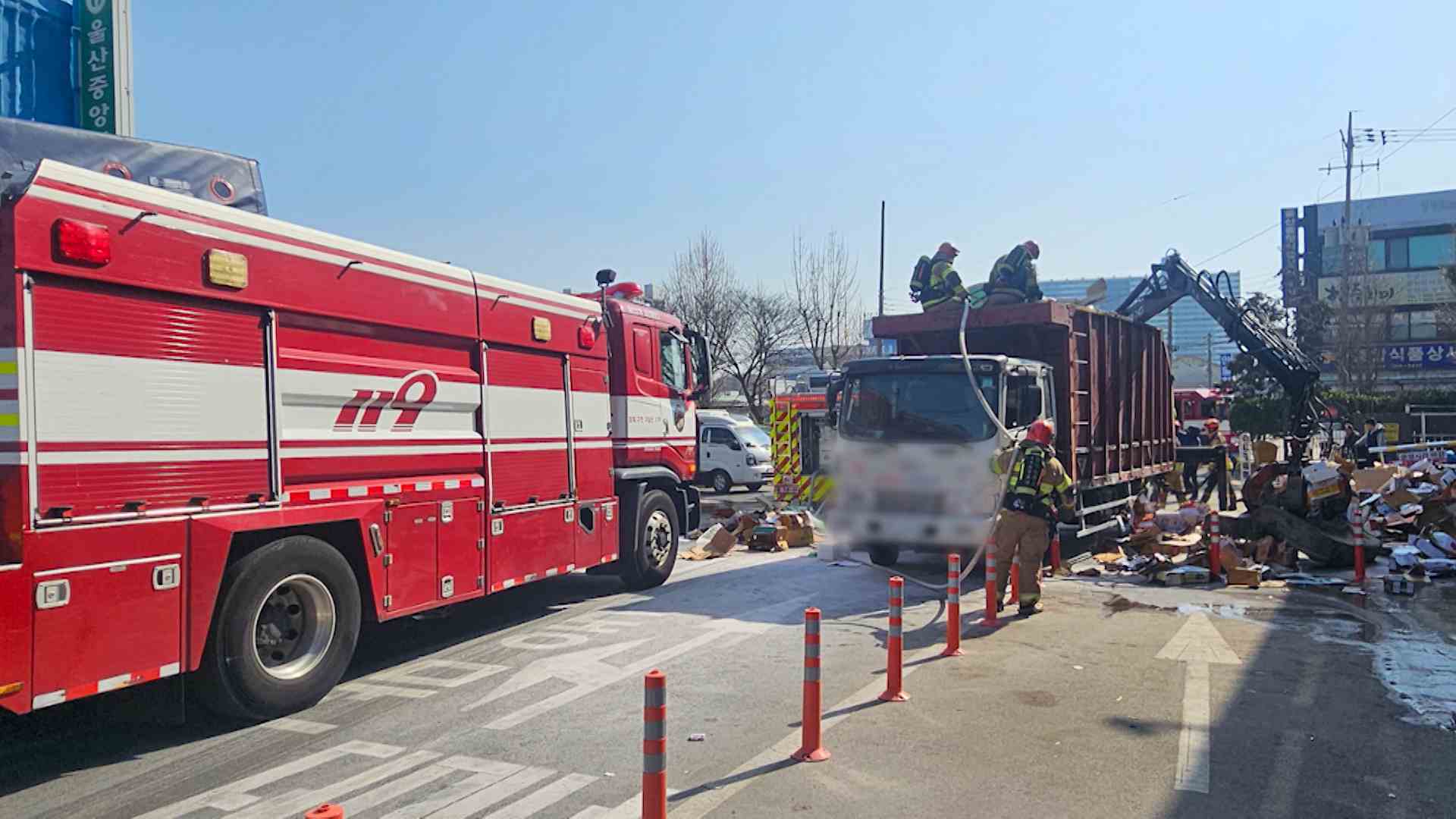 오늘(2/15) 오후 1시19분쯤 남구 삼산동 농수산물도매시장에서 폐기물 수집 운반 차량에서 불이 났습니다.불이 나자 상인과 고객들이 놀라 대피했고 출동한 소방대에 의해 20여분만에 꺼졌습니다.다행히 불은 적재함에 있던 폐기물만 태워 피해는 적었으며 소방당국은 불이 난 원인을 파악중입니다.