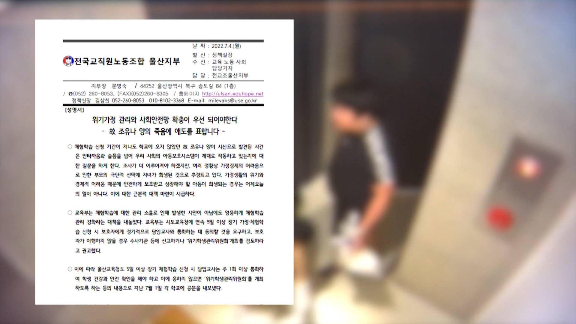 전교조 울산지부는 오늘(7/4) 성명서를 통해 고 조유나 양 사건이