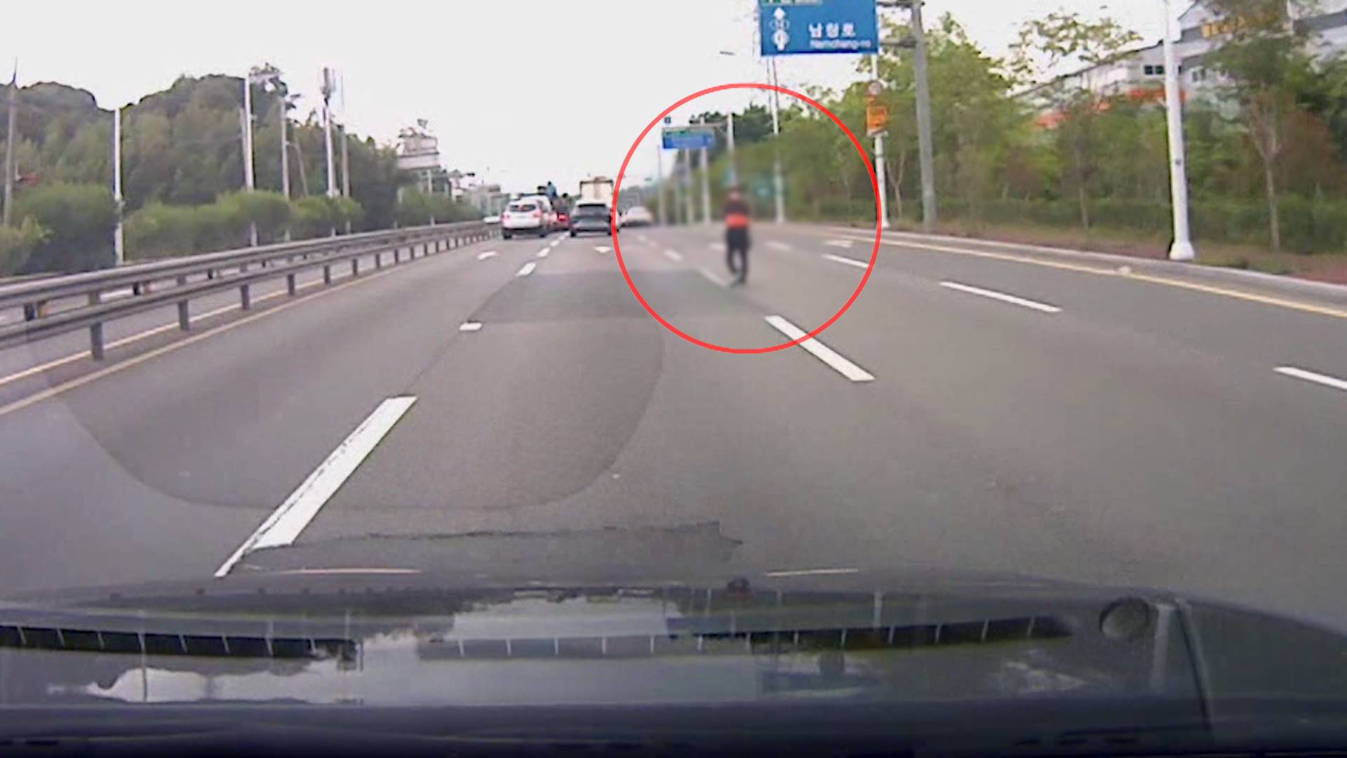 휴무 중이던 경찰관이 대형 화물차가 다니는 도로 한복판을 걸어가던 한 남성을 발견해 안전하게 구조했습니다.