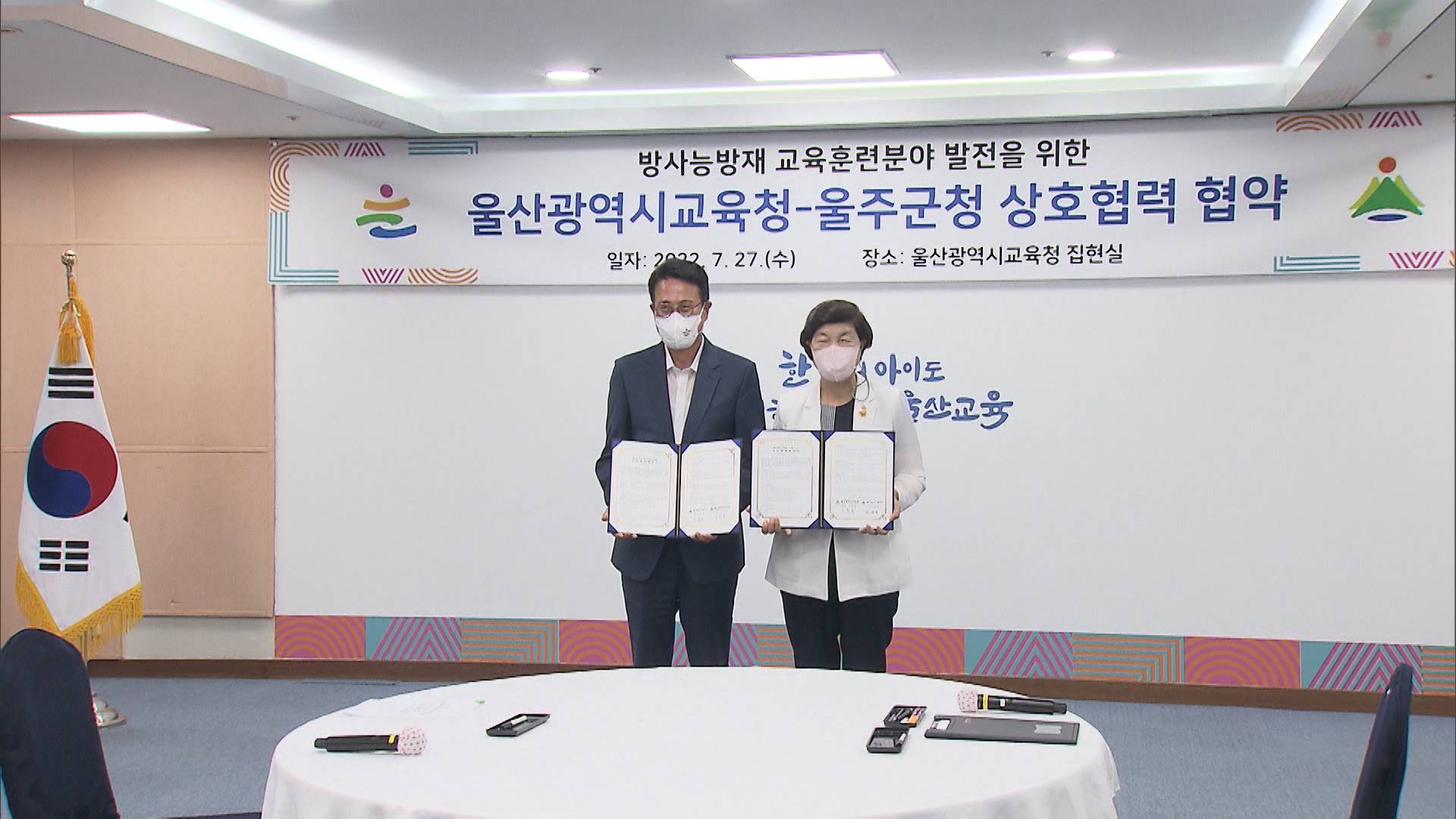 울산시교육청과 울주군이 방사능방재 교육훈련분야 발전을 위해 상호협력하기로 하고 오늘(7/27) 협약식을 가졌습니다.