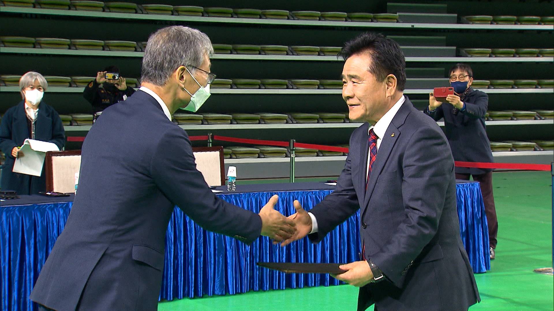 이번 선거에는 전체 455명의 선거인단 가운데 415명이 투표에 참여해 기호1번 김철욱 후보가 297표, 기호2번 김석기 후보가 116표를 얻어 김철욱 후보가 당선됐습니다.