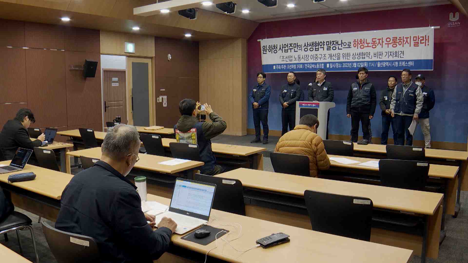 금속노조는 오늘(3/2) 울산시청 기자회견에서 조선업 노동시장의 근본 문제는 정부가 방치해 온 다단계 하청 고용구조인 만큼 상생 협약이 아니라 하청 노동자의 노동 3권을 보장하는 것이 우선이라고 주장했습니다.