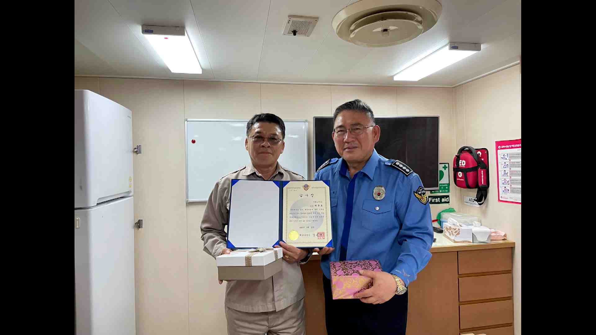 지난 21일 발생한 러시아 어선 화재 사고의 초동조치 및 구조를 도운 어선 선장들에게 인명구조 유공 현판과 해양경찰청장 감사장이 수여됐습니다.