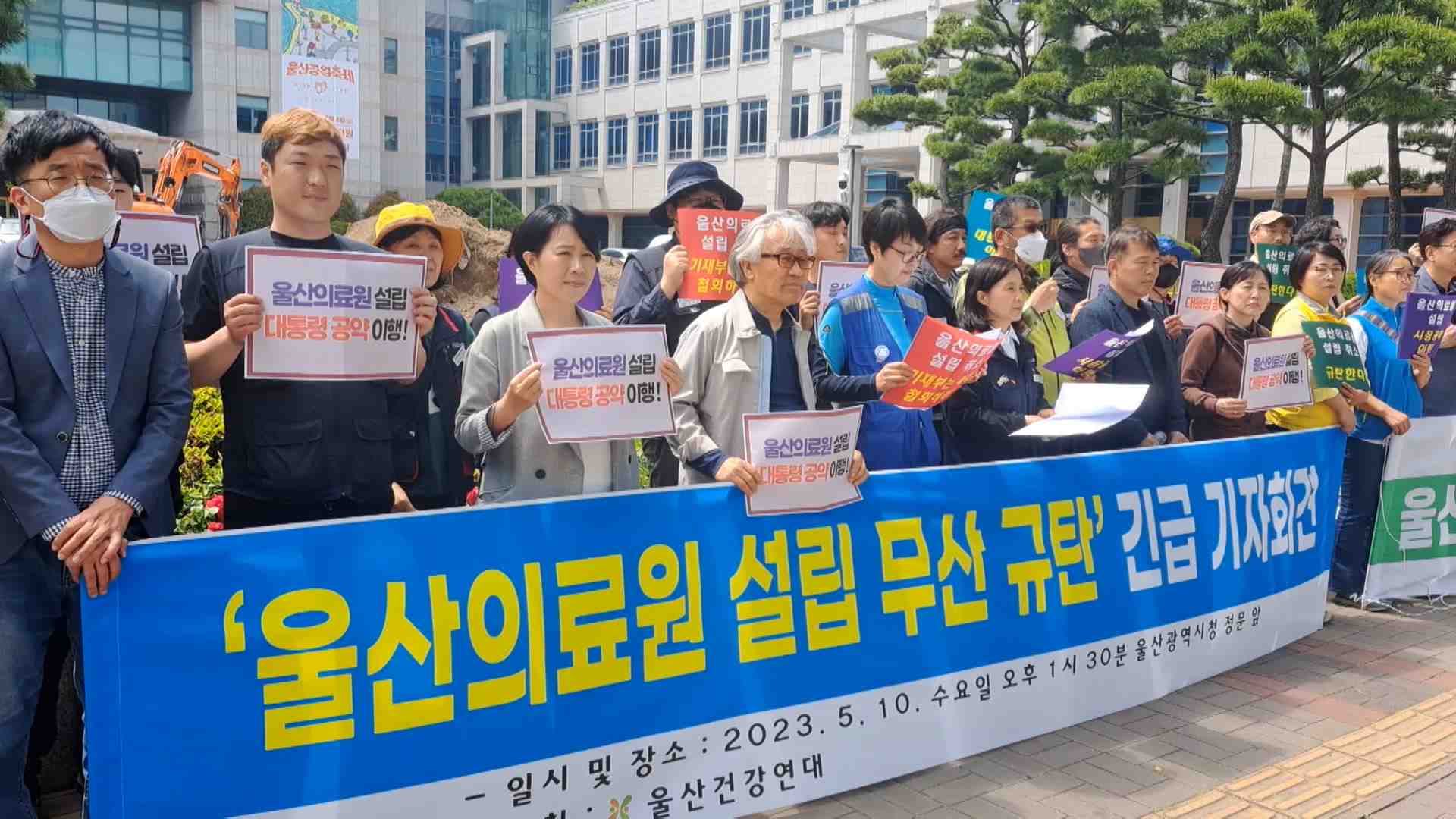 울산건강연대와 시민연대, 민주노총 등 10개 시민단체는 오늘(5/10) 울산시청 앞에서 기자회견을 열고 공공병원이 없어 시민들의 생명이 위협받고 있는 지역 실정이 중앙정부가 내세운 경제논리에 외면당했다고 주장했습니다.