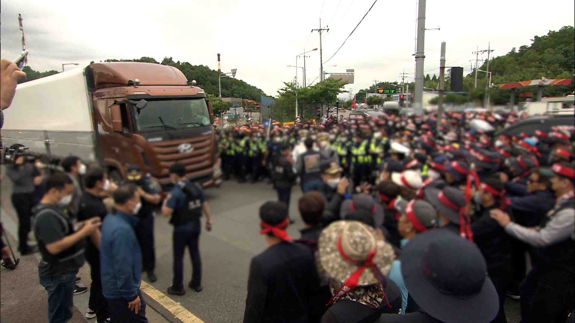 울산지법 형사6단독은 지난해 화물연대 파업 당시 도로를 점거하고 이를 저지하는 경찰관과 몸싸움을 벌인 화물연대 조합원 2명에게 각각 징역 4개월에 집행유예 1년과 벌금 500만 원을 선고했습니다.