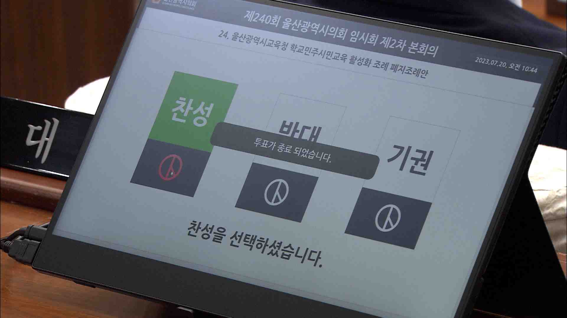 울산시의회는 오늘(7/20) 오전 열린 240회 임시회 본회의에서 '울산시교육청 학교민주시민교육 활성화 조례 폐지 조례안'을 전체 의원 22명 중 21명이 투표에 참여해 20명 찬성, 1명 반대로 원안 가결했습니다.