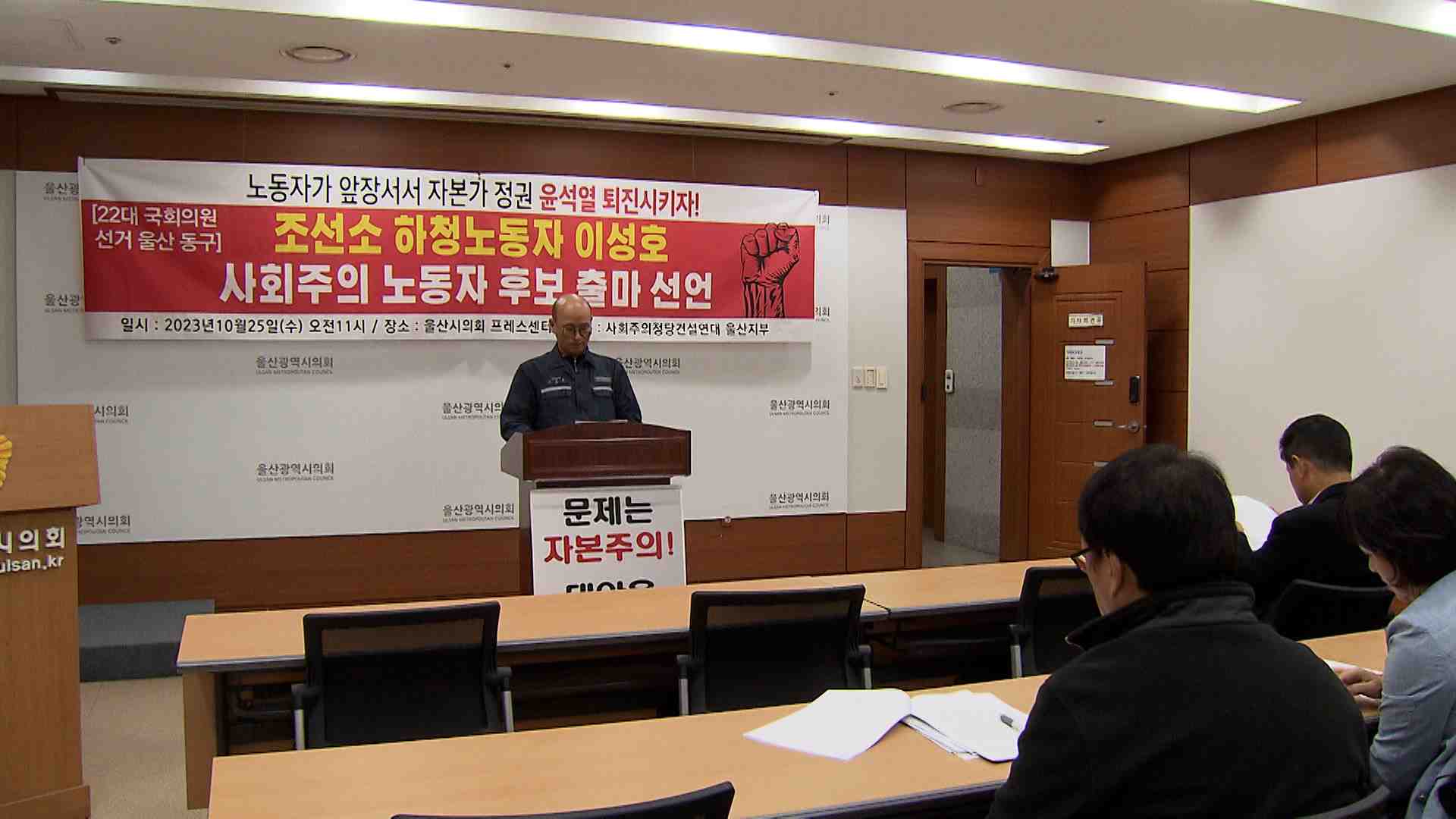 현대미포조선 협력업체인 대호기공에 근무하는 이성호씨가 오늘(10/25) 기자회견을 갖고 내년 4월 총선에서 동구에 무소속으로 출마하겠다고 밝혔습니다.