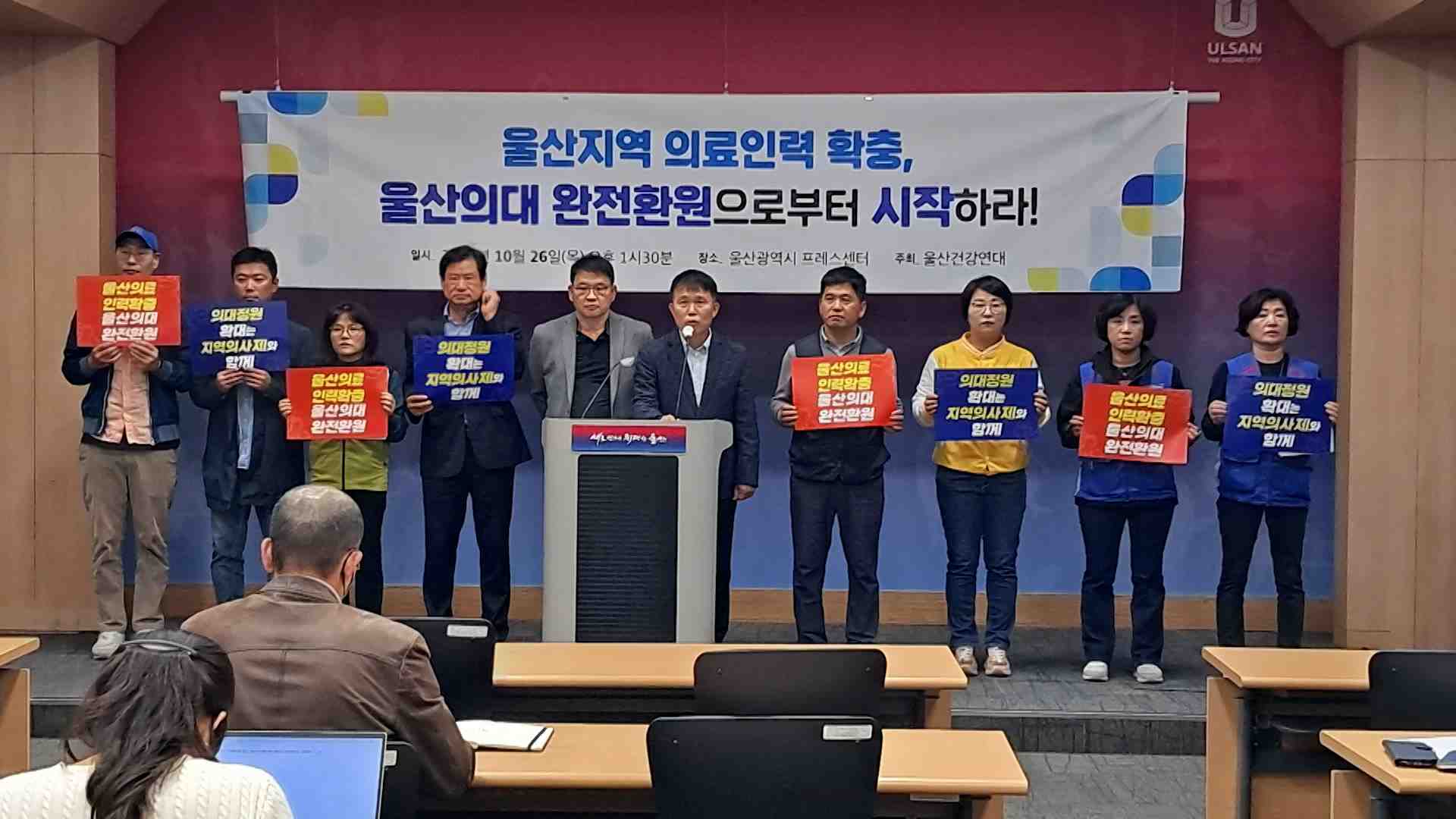 울산건강연대는 오늘(10/26) 울산시청에서 기자회견을 갖고 울산대 의대의 완전 환원을 촉구했습니다.