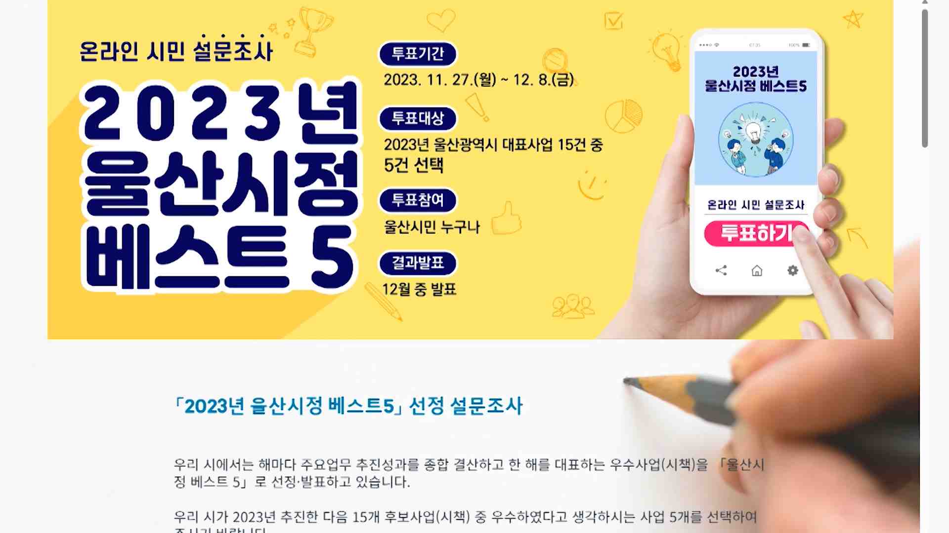 울산시가 올해 주요 시책 베스트 5를 선정해 시민체감도를 높이는 정책데이터를 수집합니다.