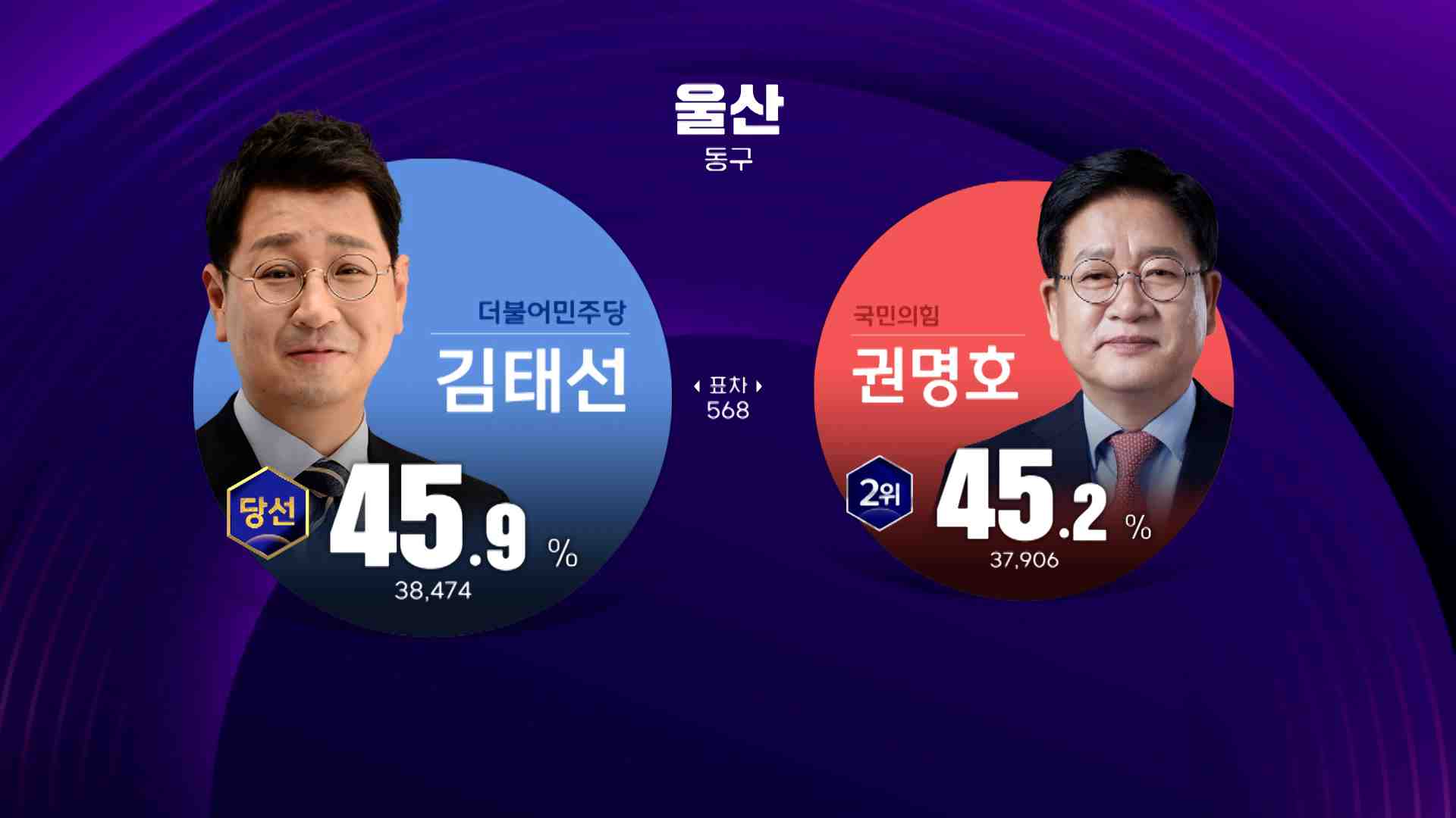 민주당 김태선 후보와 국민의힘 권명호 후보의 표 차이는 568표로, 497표 차이로 승부가 난 경남 창원진해에 이은 두번째 박빙 선거구로 기록됐습니다.