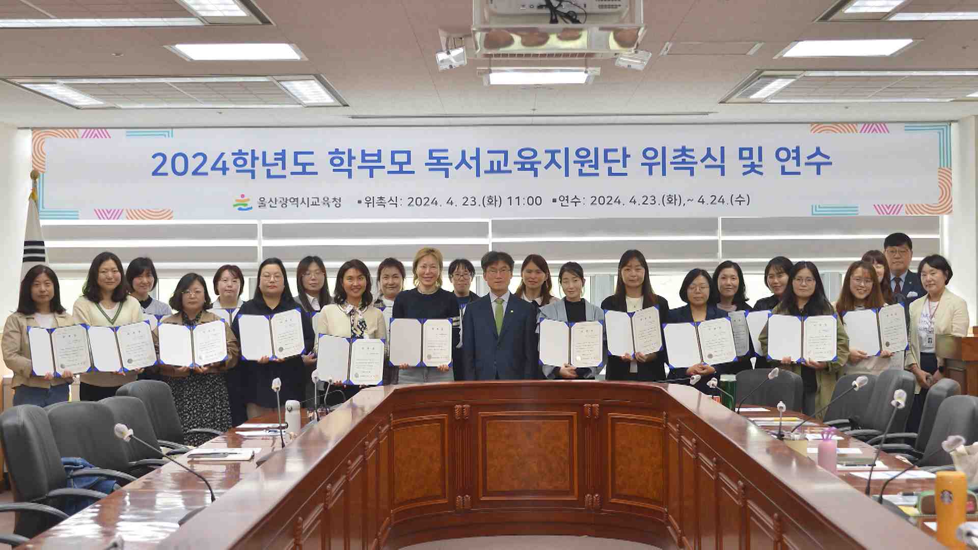울산시교육청이 학부모독서교육지원단 24명을 공개 모집을 통해 선발하고 오늘(4/23) 위촉식을 가졌습니다.