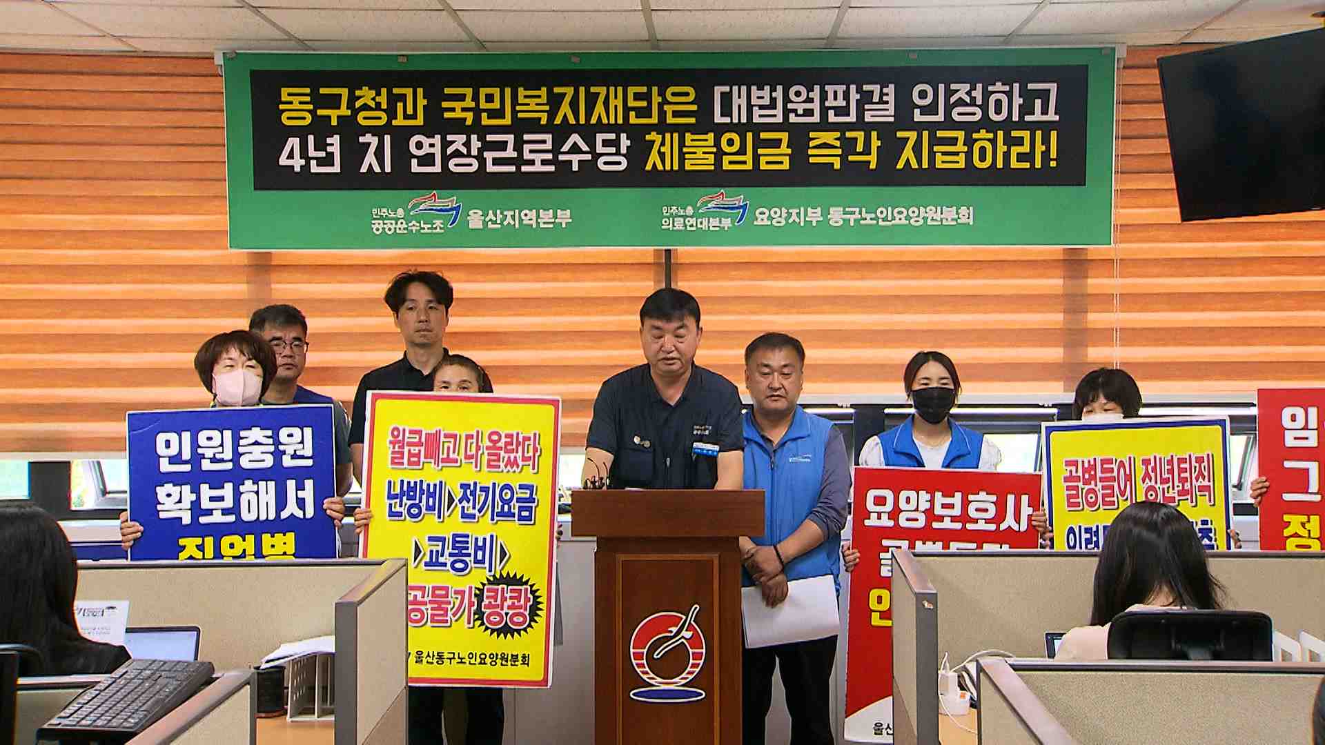 동구노인요양원 요양보호사 등 10명이 오늘(5/29) 동구청에서 기자회견을 열고 체불된 연장근로수당 지급을 촉구했습니다.