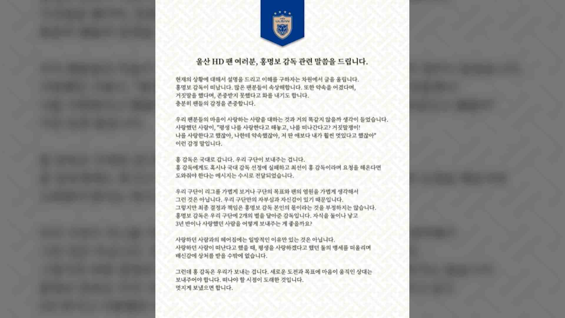 프로축구 울산HD가 김광국 대표 명의의 입장문을 통해 홍명보 감독의 이탈에도 리그 3연패를 흔들림 없이 달성하겠다고 밝혔습니다.