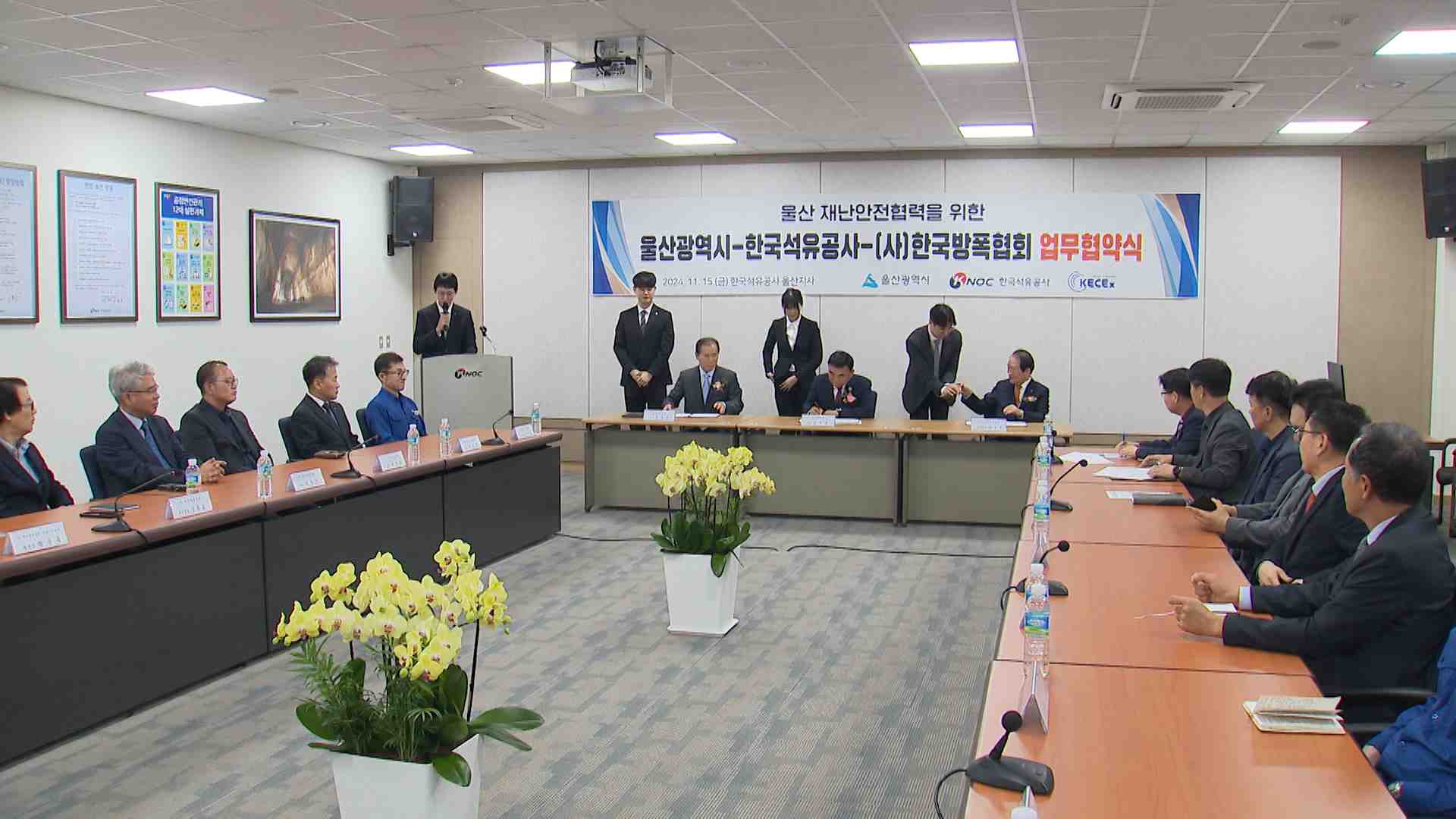 울산시는 오늘(11/15) 한국석유공사 울산비축기지에서 한국석유공사, 한국방폭협회와 함께 재난안전협력을 위한 업무협약을 체결했습니다.
