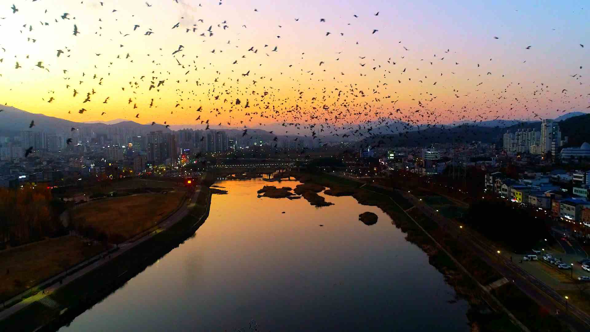 시베리아, 몽골에서 울산으로 날아온 떼까마귀는 매일 오후 4시 30분쯤 잠을 자기 위해 태화강 대나무숲으로 모여 5시 30분쯤 군무를 펼치며 대나무숲으로 들어갑니다.