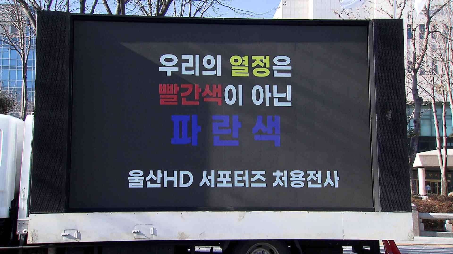 울산HD 팬들로 구성된 파란 문수 지키기 비상대책위원회는 오늘 저녁에 이어 내일 저녁 6시에도 남구 현대백화점 앞에서 빨간색 관람석 반대 응원 문화제를 다고 밝혔습니다.