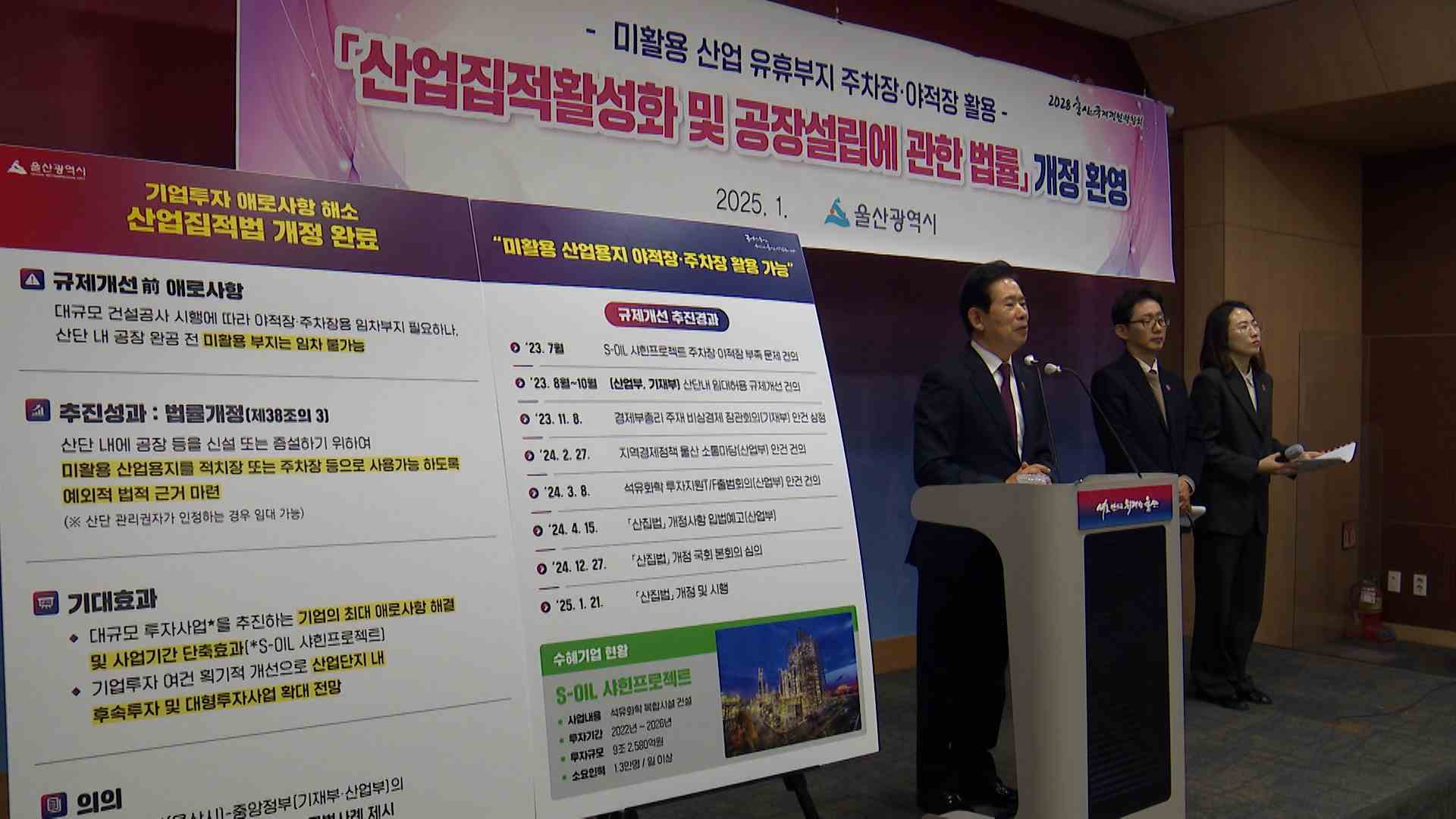 울산시는 오늘(1/21) 산업집적활성화와 공장설립에 관한 법률 개정안이 공포돼 산단 내 대규모 공장 신축·증설 시 인근 유휴부지를 임대할 수 있는 법적 근거가 마련됐다고 설명했습니다.