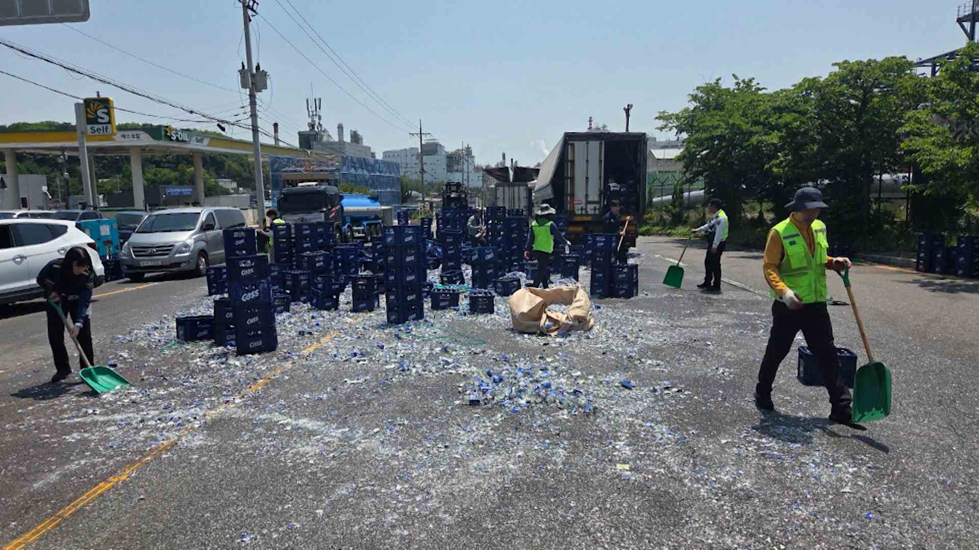 오늘(5/12) 오전 11시쯤 남구 상개 삼거리에서 우회전하던 트레일러 차량에서 맥주 상자가 쏟아져 2시간가량 교통 정체가 빚어졌습니다.