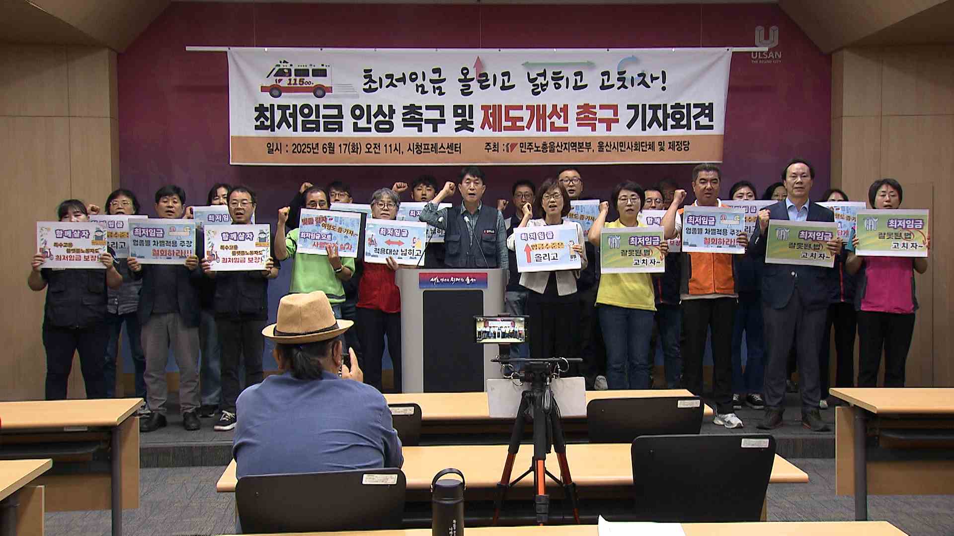 민주노총 울산본부는 오늘(6/17) 울산시청에서 기자회견을 열고 내년 최저임금 요구 금액을 올해 최저임금 시급보다 14.7% 인상된 시급 1만 1천5백 원 제시했습니다.