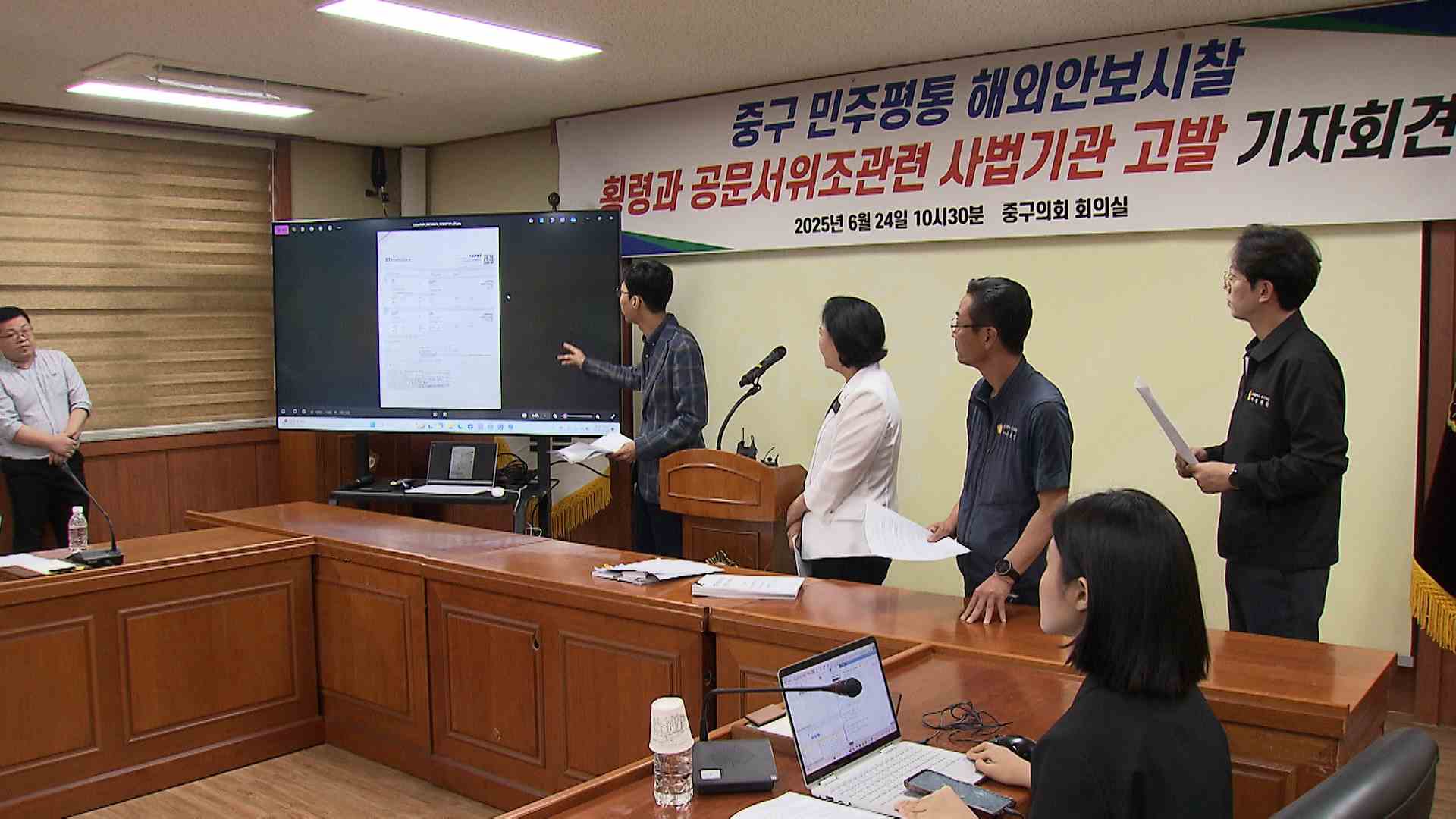 이들은 지난해 9월 김영길 중구청장과 민주평통 위원 등 27명이 출장 항공권을 위·변조해 실제 항공료보다 많은 예산을 지출했다고 주장했습니다.