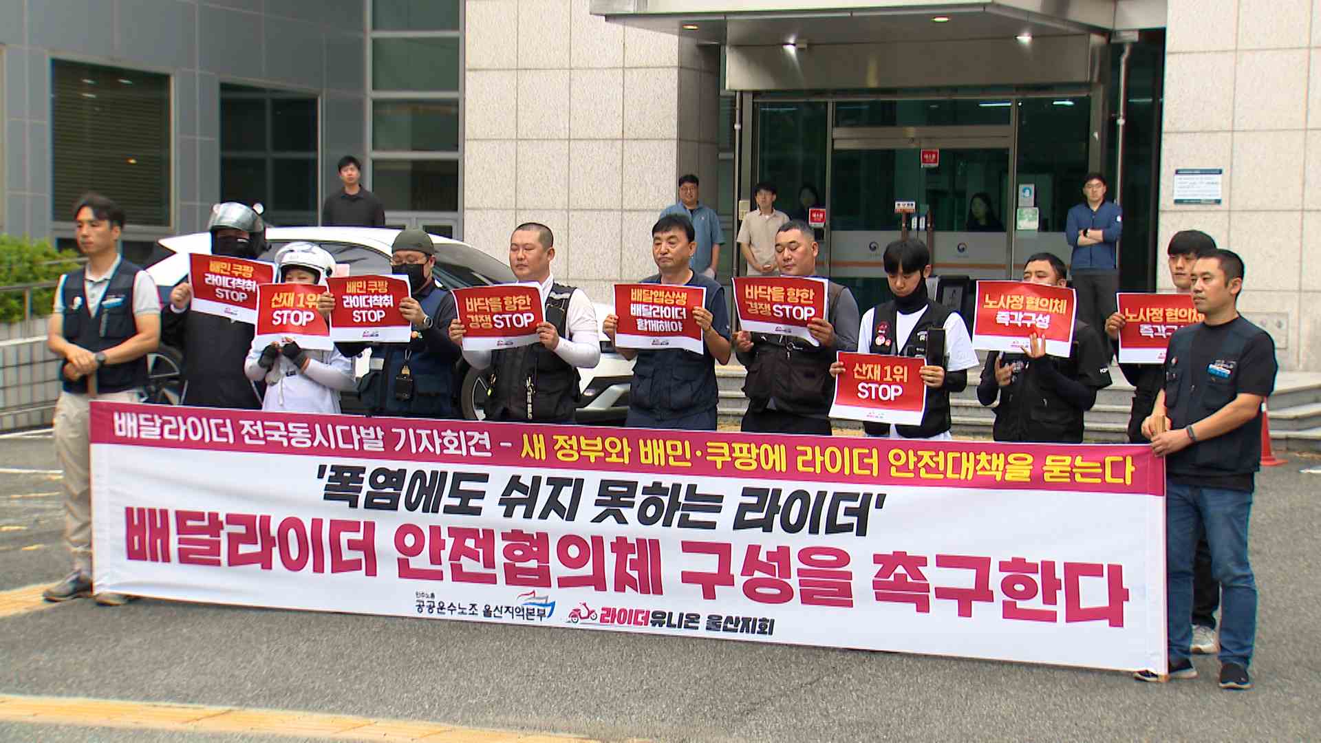 민주노총 라이더유니온지부가 오늘(7/16) 울산고용노동지청 앞에서 기자회견을 열고 배달 라이더들을 위한 안전협의체를 요구했습니다.