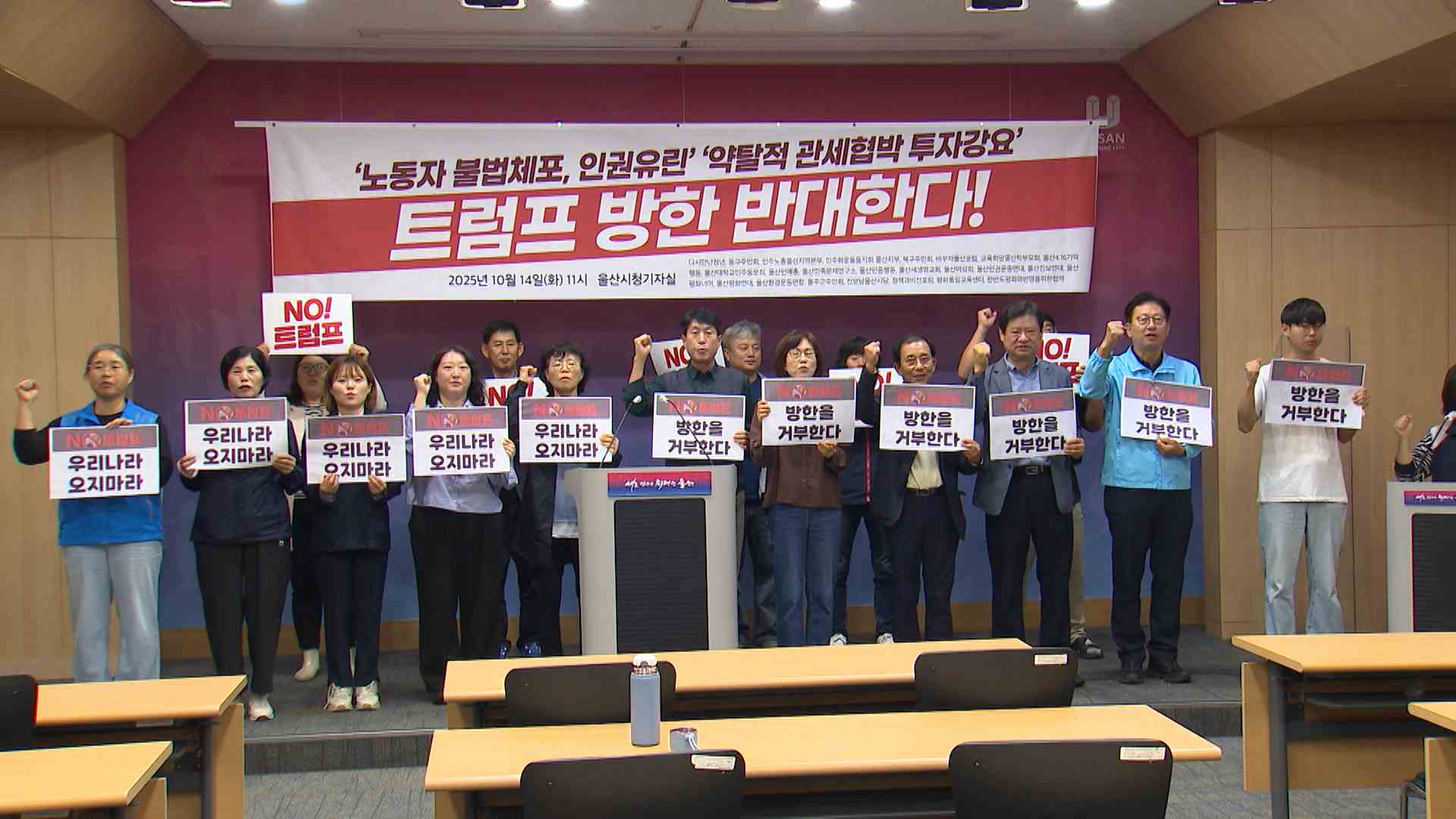민주노총 울산본부를 비롯한 울산 지역 시민단체들이 오늘(10/14) 기자회견을 열고, APEC 정상회의 기간 예정된 미국 트럼프 대통령의 방한에 반대 입장을 밝혔습니다.