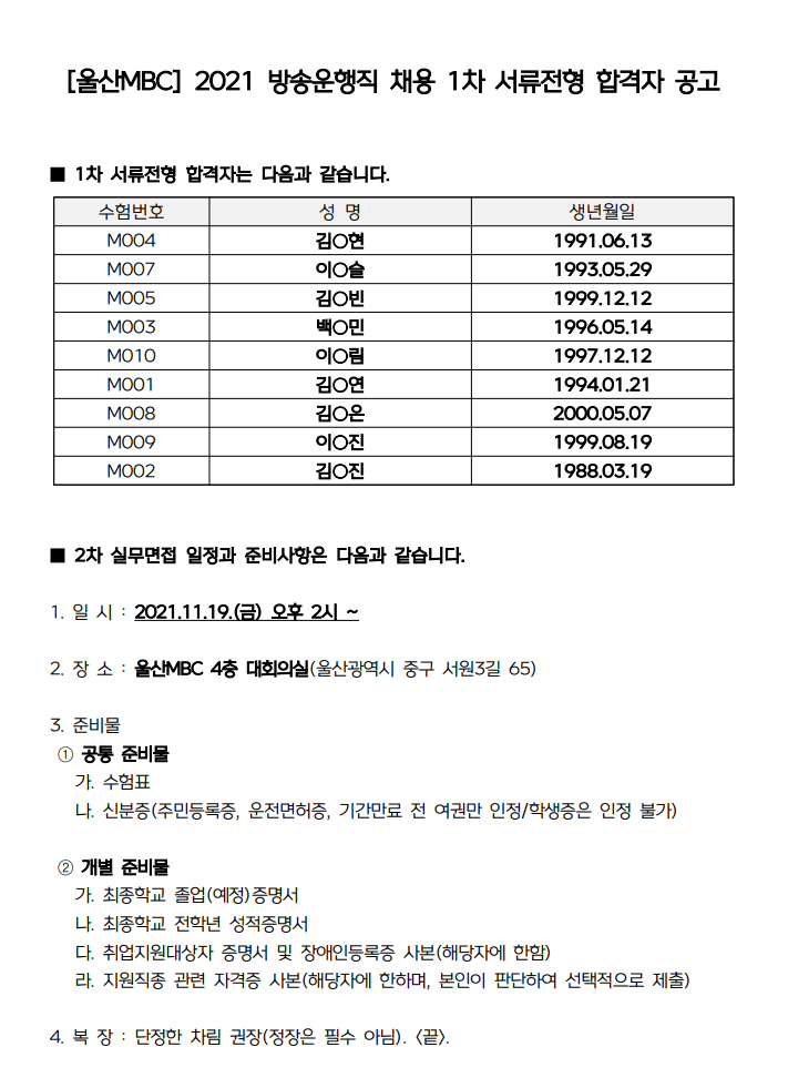 공지사항 2021 계약직 MD(방송운행직) 1차 서류전형 합격자 발표 등록일 : 2021-11-16 09:49 조회수 : 313 첨부파일 HyX1Ux9xR2N8kt-[울산MBC]2021방송운행직1차서류전형합격자공고문.pdf (22.97 KB) 다운로드 수정 삭제 이전글 다음글 목록