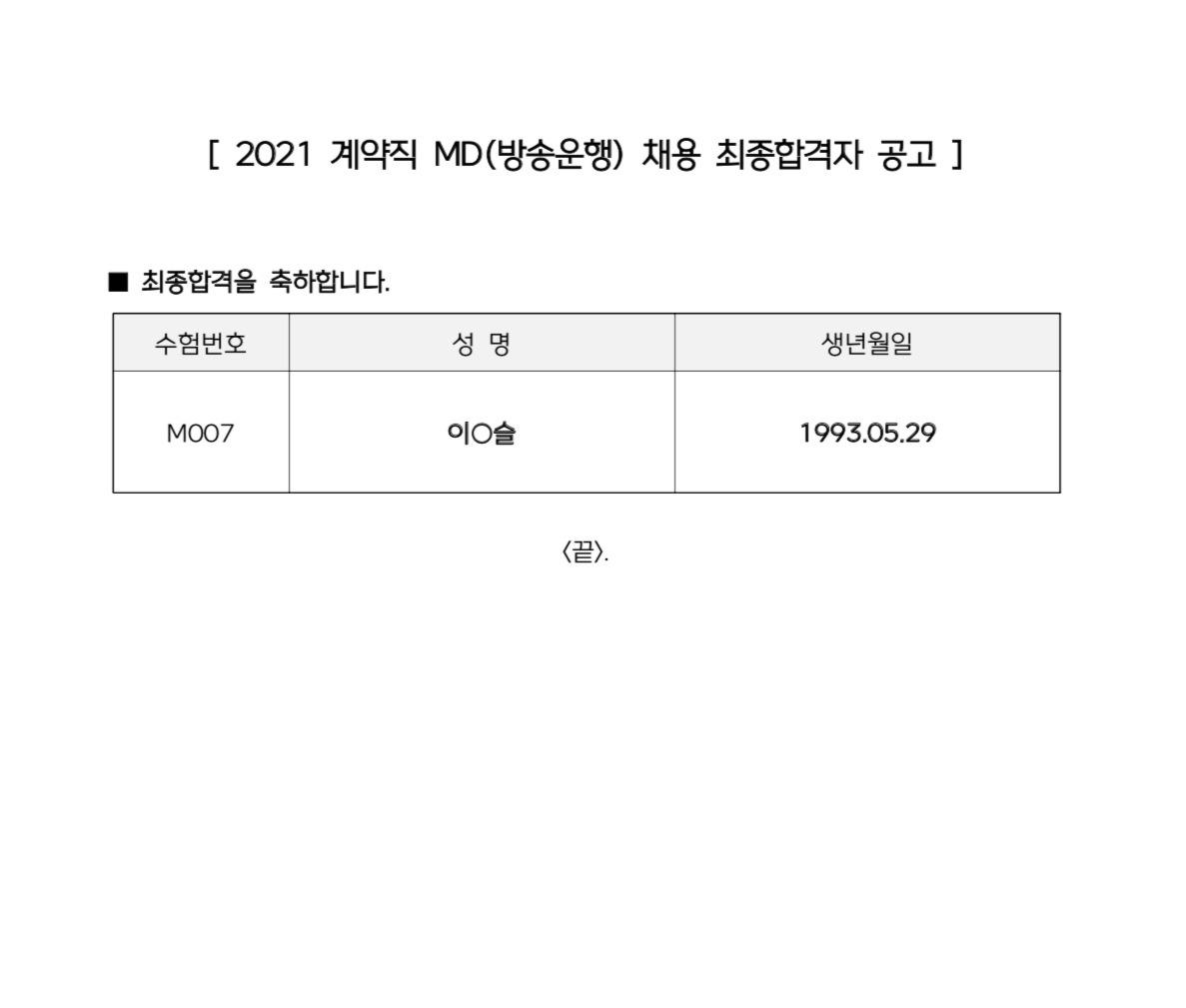 2021 계약직 MD(방송운행직) 최종 합격자 발표