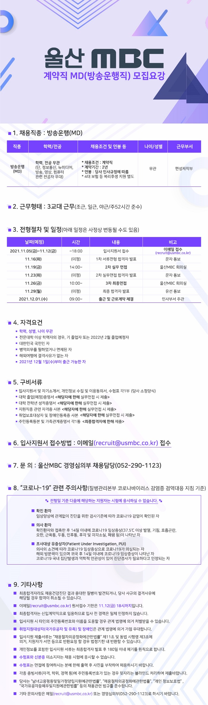 공지사항 2021 계약직 MD(방송운행직) 채용 공고 등록일 : 2021-11-01 09:09 조회수 : 445 ▶ 입사지원서 다운로드 ◀\n\n[관리자에 의하여 수정되었습니다.] 첨부파일 yNGLiTQa8Lki-2021 계약직 MD(방송운행직) 채용 문서.zip (27.48 KB) 다운로드 수정 삭제 이전글 다음글 목록