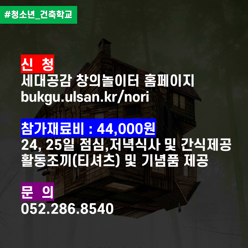 북구 세대공감 창의놀이터에서 새로운 기획프로그램 '청소년 건축학교'를 진행할 예정입니다. 10월 17일(토), 24일(토), 25일(일) 3일간.