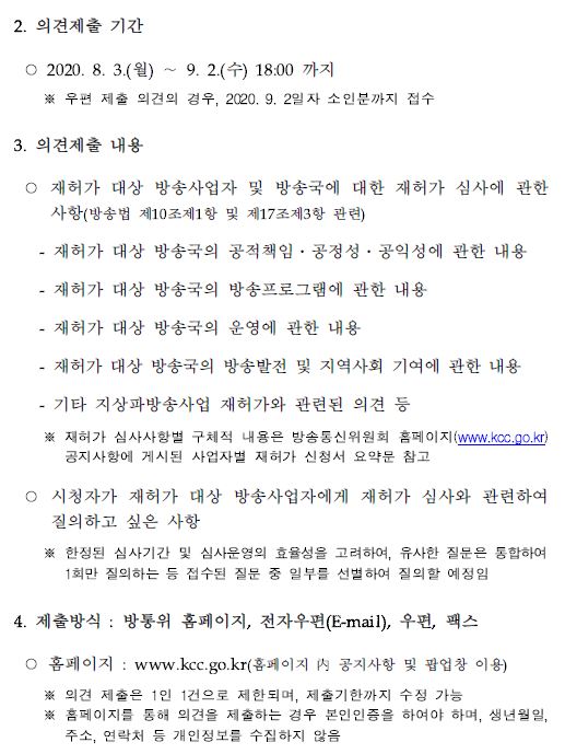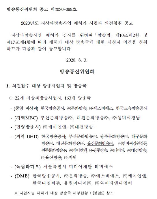 시청자의견 2020년도 울산MBC 재허가 시청자 의견 청취 공고 등록일 : 2020-07-31 09:40 조회수 : 6575 첨부파일 xnsSaAlnk1kpzEi-방송통신위원회 공고 제2020-088호(2020년도 지상파방송사업 재허가 시청자 의견청취 공고... (28.50 KB) 다운로드 여러분의 의견을 남겨주세요 ※ 댓글 작성시 상대방에 대한 배려와 책임을 담아 깨끗한 댓글 환경에 동참해 주세요. 0/2000 등록 수정 삭제 이전글 다음글 목록