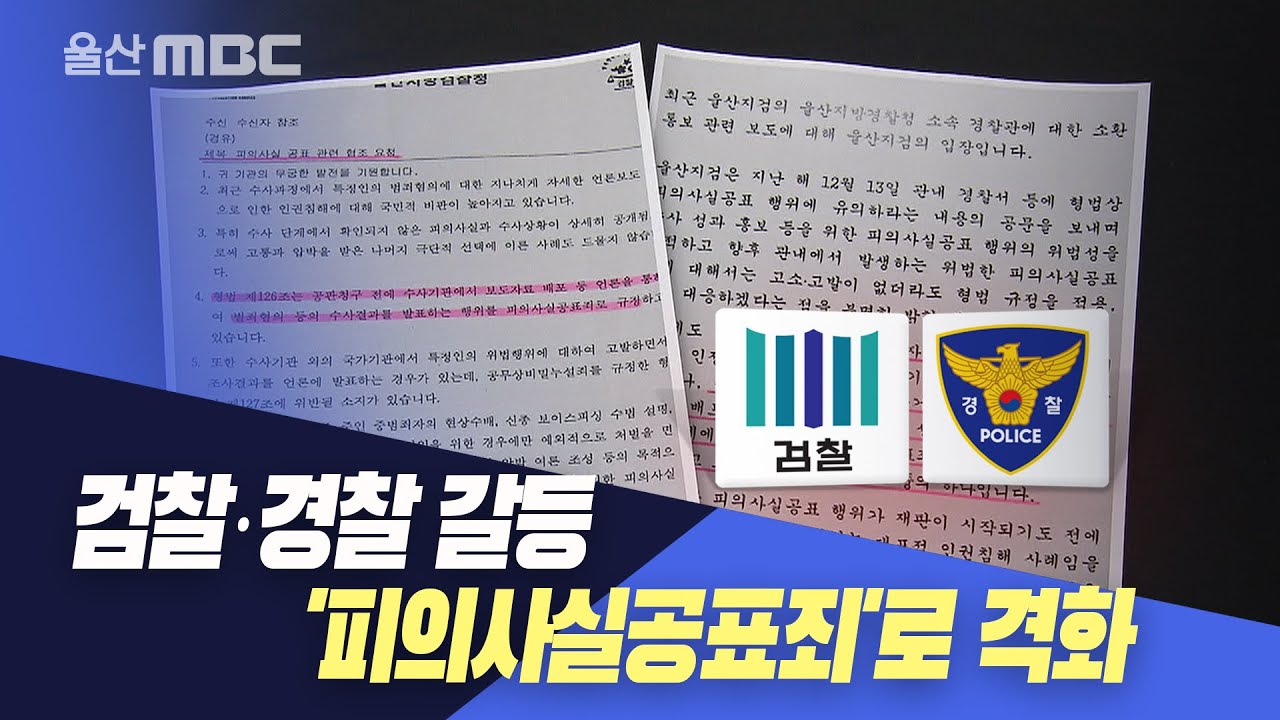 ◀ANC▶ 울산지검이 최근 범죄수사 성과를 언론에 알린 경찰관을 상대로 '피의사실공표죄' 위반 여부를 따져 묻고 있습니다. 그런데 이들은 2년 전 고래고기 환부 사건을 수사해온 광역수사대 소속 경찰관들로, 검찰 수사가 어떤 목적을 갖고 있는 게 아니냐는 반발이 나오고 있습니다. 유독 울산에서 검·경 갈등이 심화되...