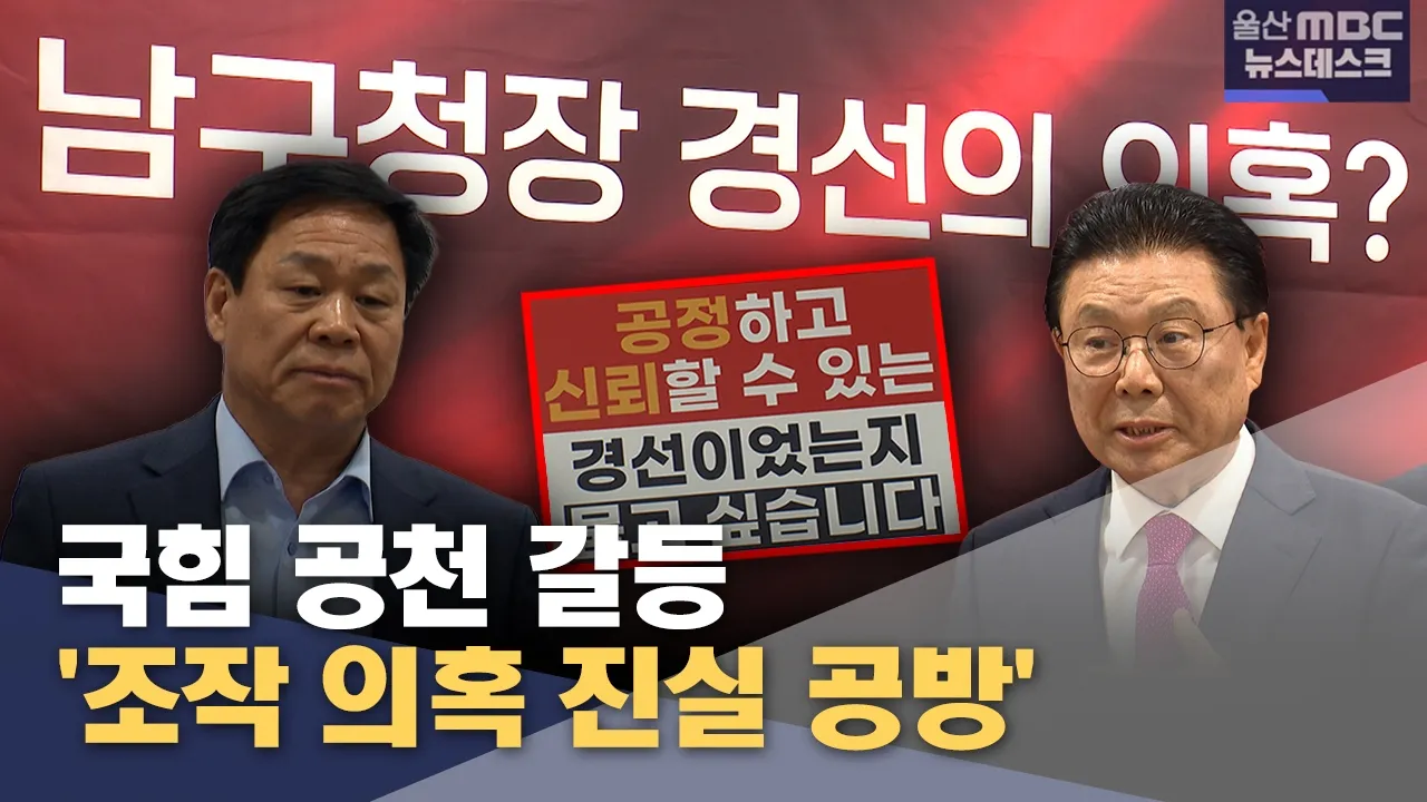 주요뉴스 국힘 공천 갈등‥ '조작 의혹 진실 공방' [앵커]전국적으로 국민의힘 공천 갈등의 골이 깊어지고 있는 가운데 울산에서도 남구청장 경선과 관련한 의혹과 폭로가 이어지고 있습니다.울산시당 공천관리위원장인 박성민 의원이 경선 과정에 개입했다는 주장이 나오면서 진실 공방으로 치닫고 있습니다.최지호 기자[리포트]국민의힘 남구청장 후보 경선에 탈락한 김동... 민주당 남구청장 '최덕종'·동구청장 '김대연' 공천 MBC뉴스데스크 61 기초학력·맞춤형 지원, '전국 표준' 됐다 MBC뉴스데스크 57 'K-방산' 미래 먹거리‥ "MRO 시장 잡아라" MBC뉴스데스크 95 중동 지역 수입 '급감'‥ 대체품 수입 증가 MBC뉴스데스크 44 "작천정 벚꽃축제 26만 명 방문" 흐리고 저녁까지 비‥ 강한 바람 주의 김동칠 "남구청장 경선 불공정 의혹"‥ 가처분 검토 박맹우, 공천 개입 의혹 "박성민 의원 사퇴해야" 울산시민연대 "세계음식문화관 사업 감사청구" 소상공인 긴급 대책‥ 특례보증·포장재 지원 국제정원박람회 조직위-경남은행 '주거래은행' 협약 울산기능경기대회 개막‥ 25개 직종 130명 참가 온산공단 유해 화학물질 누출… 위기경보 '관심' 발령 기획·연속 보도 [되돌아본 뉴스] '콩나물 교실' 옛말 같지만‥ 불균형 심화 MBC뉴스데스크 135 [되돌아본 뉴스] 귀향버스부터 해외여행까지.. 달라진 명절 이동 MBC뉴스데스크 197 [연속기획③] '대세론' 속 '신중론'‥ 행정통합 해법은? MBC뉴스데스크 210 [연속기획 ②] 대한민국 경제 심장 울산‥ 시민 삶의 질은? MBC뉴스데스크 858 [연속기획①] 2%가 짊어진 무게‥ 힘차게 뛰는 산업 심장 MBC뉴스데스크 195 [되돌아본 뉴스] '전형적'에서 '극과 극' 달라지는 겨울 MBC뉴스데스크 228 [결산2025] 키워드로 돌아본 '2025 울산 스포츠' MBC뉴스데스크 265 [결산 2025] 끝나지 않은 '내란세력 청산'‥ 지방선거 화두로 MBC뉴스데스크 217 [결산 2025] 끊이지 않는 산재 참사‥ 대형 산불에 폭우까지 MBC뉴스데스크 306 [결산 2025] 기대 모은 '공룡 조선소'‥ 남은 과제는? MBC뉴스데스크 613 영상스케치 연분홍 연꽃, 사진에 담다 [영상스케치] 189 울산 겹벚꽃 명소 [영상스케치] 165 04.16 기억과 추모 [영상스케치] 131 울산에 또 무슈샤가 [영상스케치] 164 TV 프로그램 prev next 서머페스티벌 울트라 월 화 수 18시 05분 6시 내고향 울산의 생생한 정보는 울트라가 전한다고 전해라~ 내가 사는 동네에서 벌어지는 별나고 재미난 이야기 아낌 없이 대방출! 심심하고 삼삼한 울산의 저녁을 웃음과 감동으로 채워드립니다. 체인지 UP 목 21시 00분 울산의 변화와 발전을 위해 우리가 나아가야 할 방향은? 바뀌고(change), 발전될(up) 울산을 꿈꾸며 [체인지UP]이 함께 합니다. JUMP 울산 금 17시 55분 새롭게 바뀐 2025 JUMP 울산!!매주 금요일 17:55 ~ 18:05에 만날 수 있습니다.YOUTUBE '울산MBC' 채널에서도 만날 수 있습니다!! 더보기 Radio 프로그램 prev next 더보기 뉴미디어 문화행사 prev next 더보기 공지사항 울산MBC UHD방송 수신 안내 2026-04-01 13:54 AM방송국 중단안내 2026-03-30 16:50 2026 월드 베이스볼 클래식(WBC) 기간중 TV OnAir 서비스 중단 안내 2026-02-27 10:44 2026년도 울산MBC 시청자위원 공개모집[마감] 2025-12-08 10:23 2026년 사원 공개채용 공고[마감] 2025-11-17 11:06 더보기