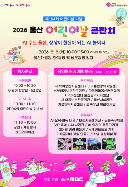 주요뉴스 낮 최고 23도‥ 밤부터 황사·강풍 주의 오늘(4/20) 울산지역은 오후 들어 다소 흐린 날씨를 보였지만, 낮 최고기온은 어제와 비슷한 23도까지 올랐습니다.내일은 대체로 맑겠고, 기온은 8도에서 22도의 분포로 낮 기온은 높지만 일교차 큰 날씨가 예상됩니다.한편 오늘 밤부터 짙은 황사가 유입되겠고 강한 바람도 부는 곳이 있어 야외활동 시 주의가 필요합니다. 울산시, 제2회 추경예산 1,989억 원 편성 MBC뉴스(저녁) 31 중동 전쟁 여파에도 3월 수출액 12년 만에 최고치 MBC뉴스(저녁) 25 DN오토모티브 납 기준 초과… 과태료 4,620만 원 MBC뉴스(저녁) 30 민주당, 지방선거 공천 완료 "원팀으로 승리" MBC뉴스(저녁) 24 방인섭 시의원 "개혁신당 후보로 남구청장 도전" 이미영 전 시의원 "남갑 국회의원 보궐선거 도전" 구광렬 "선거 완주"‥ 김주홍 "정책에 집중" 울주군보건소 공보의 1명 추가‥ 의사 못 구해 태화강 국가정원 죽순 무단 채취 감시 울산시 기후변화주간 운영‥ 동시 소등 참여 낮 최고 기온 23도‥ 미세먼지 주의 [MBC가 만난 사람] 김도형 울산시 장애인복지과장 울산 등록외국인 3만 명 돌파‥지원센터 통합 운영 기획·연속 보도 [되돌아본 뉴스] '콩나물 교실' 옛말 같지만‥ 불균형 심화 MBC뉴스데스크 164 [되돌아본 뉴스] 귀향버스부터 해외여행까지.. 달라진 명절 이동 MBC뉴스데스크 207 [연속기획③] '대세론' 속 '신중론'‥ 행정통합 해법은? MBC뉴스데스크 218 [연속기획 ②] 대한민국 경제 심장 울산‥ 시민 삶의 질은? MBC뉴스데스크 880 [연속기획①] 2%가 짊어진 무게‥ 힘차게 뛰는 산업 심장 MBC뉴스데스크 214 [되돌아본 뉴스] '전형적'에서 '극과 극' 달라지는 겨울 MBC뉴스데스크 241 [결산2025] 키워드로 돌아본 '2025 울산 스포츠' MBC뉴스데스크 281 [결산 2025] 끝나지 않은 '내란세력 청산'‥ 지방선거 화두로 MBC뉴스데스크 226 [결산 2025] 끊이지 않는 산재 참사‥ 대형 산불에 폭우까지 MBC뉴스데스크 313 [결산 2025] 기대 모은 '공룡 조선소'‥ 남은 과제는? MBC뉴스데스크 649 영상스케치 연분홍 연꽃, 사진에 담다 [영상스케치] 201 울산 겹벚꽃 명소 [영상스케치] 278 04.16 기억과 추모 [영상스케치] 144 울산에 또 무슈샤가 [영상스케치] 173 TV 프로그램 prev next 체인지 UP 목 21시 00분 울산의 변화와 발전을 위해 우리가 나아가야 할 방향은? 바뀌고(change), 발전될(up) 울산을 꿈꾸며 [체인지UP]이 함께 합니다. 울트라 월 화 수 18시 05분 6시 내고향 울산의 생생한 정보는 울트라가 전한다고 전해라~ 내가 사는 동네에서 벌어지는 별나고 재미난 이야기 아낌 없이 대방출! 심심하고 삼삼한 울산의 저녁을 웃음과 감동으로 채워드립니다. JUMP 울산 금 17시 55분 새롭게 바뀐 2025 JUMP 울산!!매주 금요일 17:55 ~ 18:05에 만날 수 있습니다.YOUTUBE '울산MBC' 채널에서도 만날 수 있습니다!! 서머페스티벌 더보기 Radio 프로그램 prev next 더보기 뉴미디어 문화행사 prev next 더보기 공지사항 울산MBC UHD방송 수신 안내 2026-04-01 13:54 AM방송국 중단안내 2026-03-30 16:50 2026 월드 베이스볼 클래식(WBC) 기간중 TV OnAir 서비스 중단 안내 2026-02-27 10:44 2026년도 울산MBC 시청자위원 공개모집[마감] 2025-12-08 10:23 2026년 사원 공개채용 공고[마감] 2025-11-17 11:06 더보기