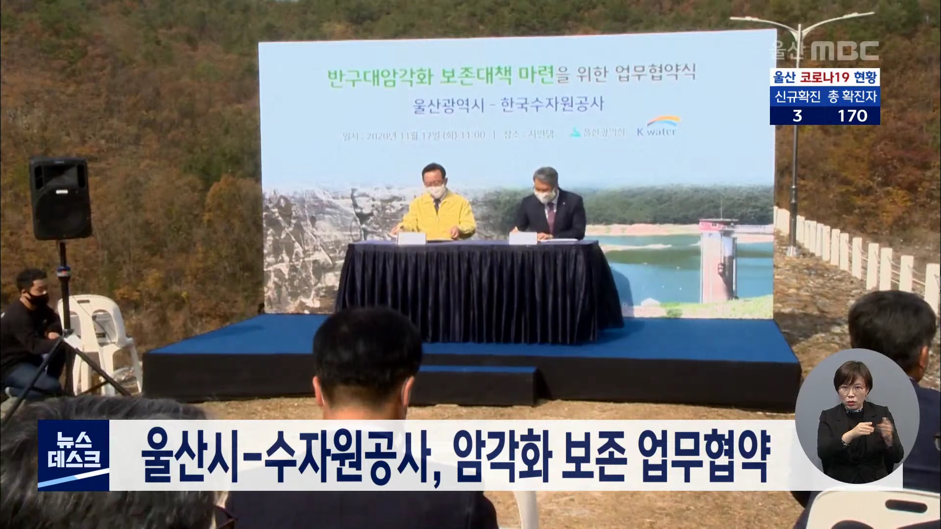울산시와 한국수자원공사가 사연댐 수위 조절과 수문 설치 등 반구대 암각화 보존대책을 마련하는 데 협력하겠다며 업무협약을 체결했습니다. 협약에 따라 울산시와 한국수자원공사는 사연댐에 수문을 설치해 수위를 조절하는 방안이 타당한 지에 대해 용역을 실시하고, 울산시의 먹는 물 문제 등 관련 현안에 협력하기로 ...