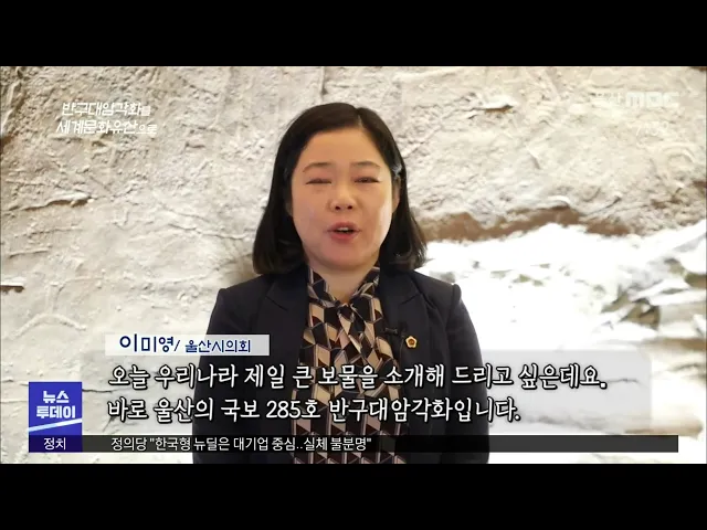 이미영 / 울산시의회 오늘 우리나라 제일 큰 보물을 소개해 드리고 싶은데요. 바로 울산의 국보 285호 반구대암각화입니다. 약 70여종의 200여점의 그림이 그려진 암각화인데요. 1971년 세상빛을 보게 된 암각화. 정말 중요하겠죠? 매년 비가 많이 올 때면 1년에 3개월정도 물에 잠겨있다고해서 마음이 많이 아픈데요. 우리...